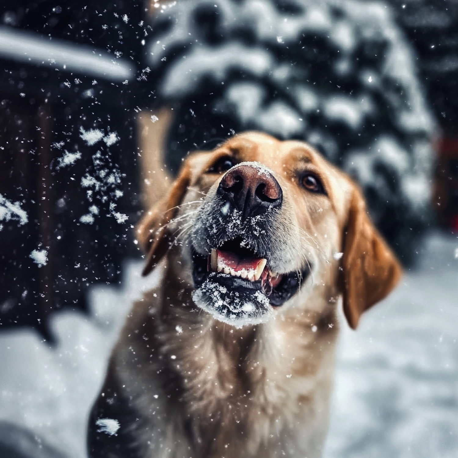 Golden retriever joyfully playing in the snow, with snowflakes on its nose and a blurred snowy background.