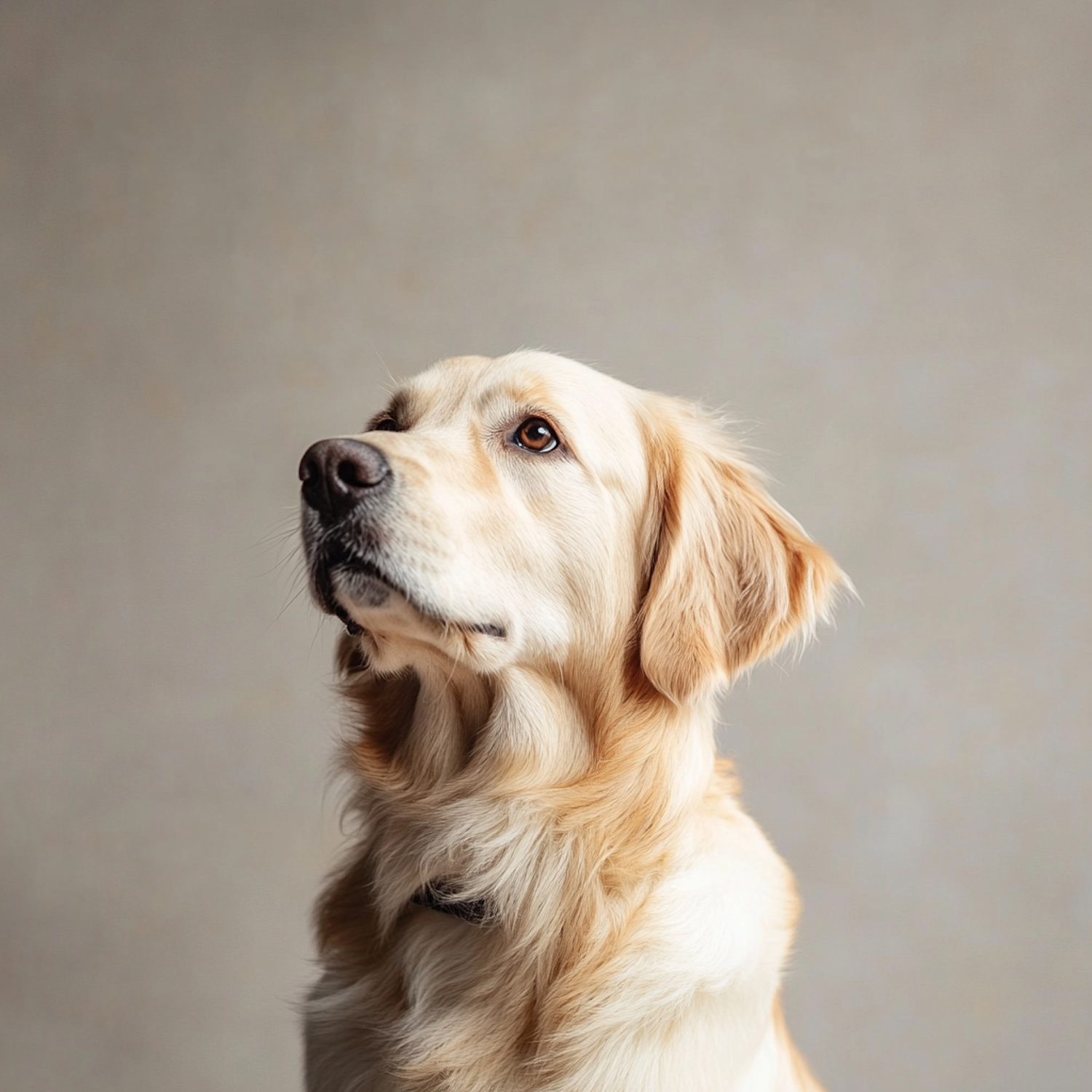 A golden retriever with a soft cream coat gazes upward against a neutral background, exuding calm and elegance.