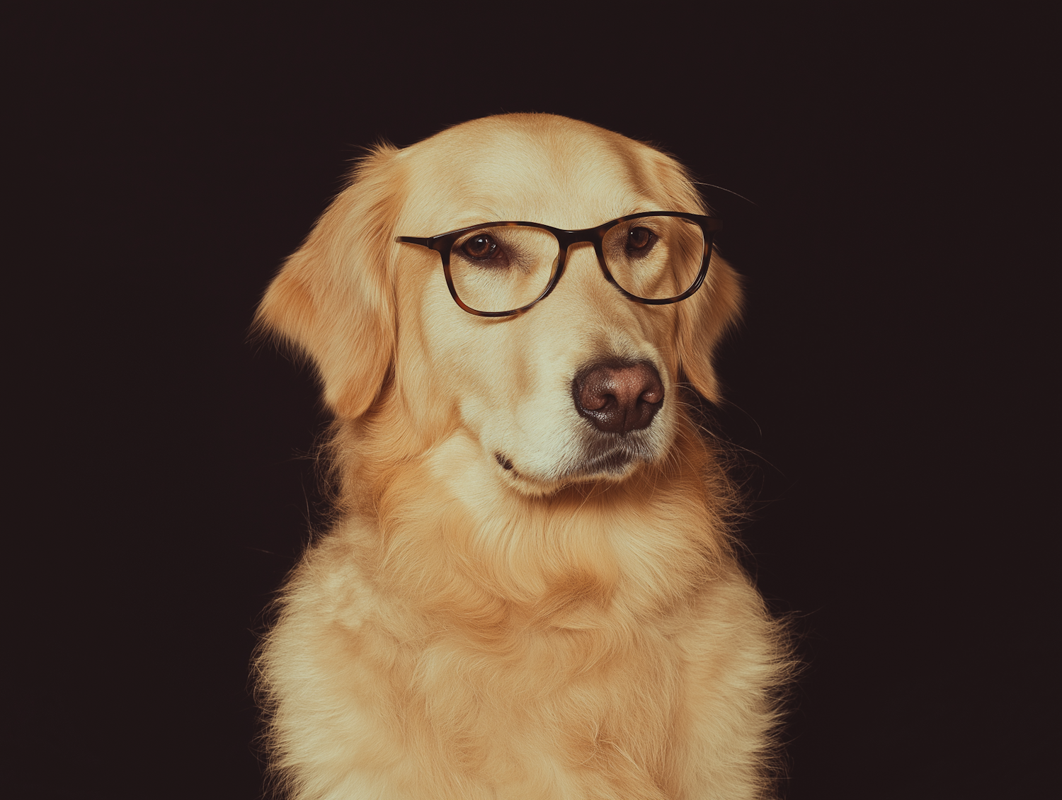 A cute golden retriever in glasses, sitting against a dark background. Its elegant pose and expressive face make it irresistible.
