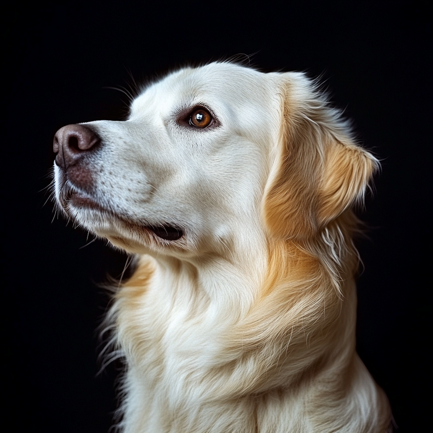 Close-up portrait of a golden retriever with a creamy coat and expressive eyes against a dark background.