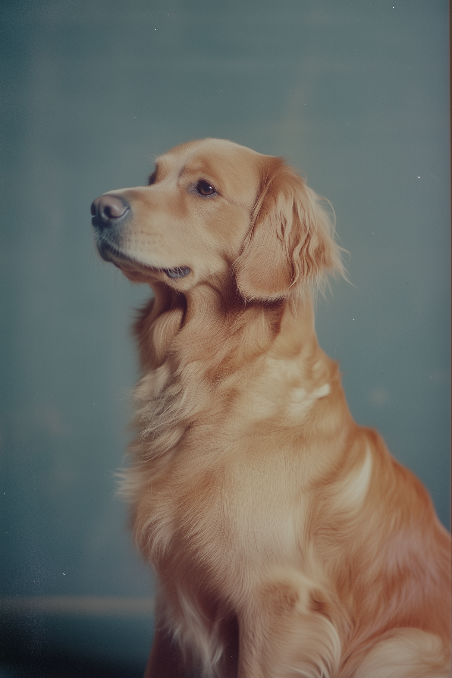 Golden retriever with rich golden fur sits against a soft blue background, exuding calmness and grace.