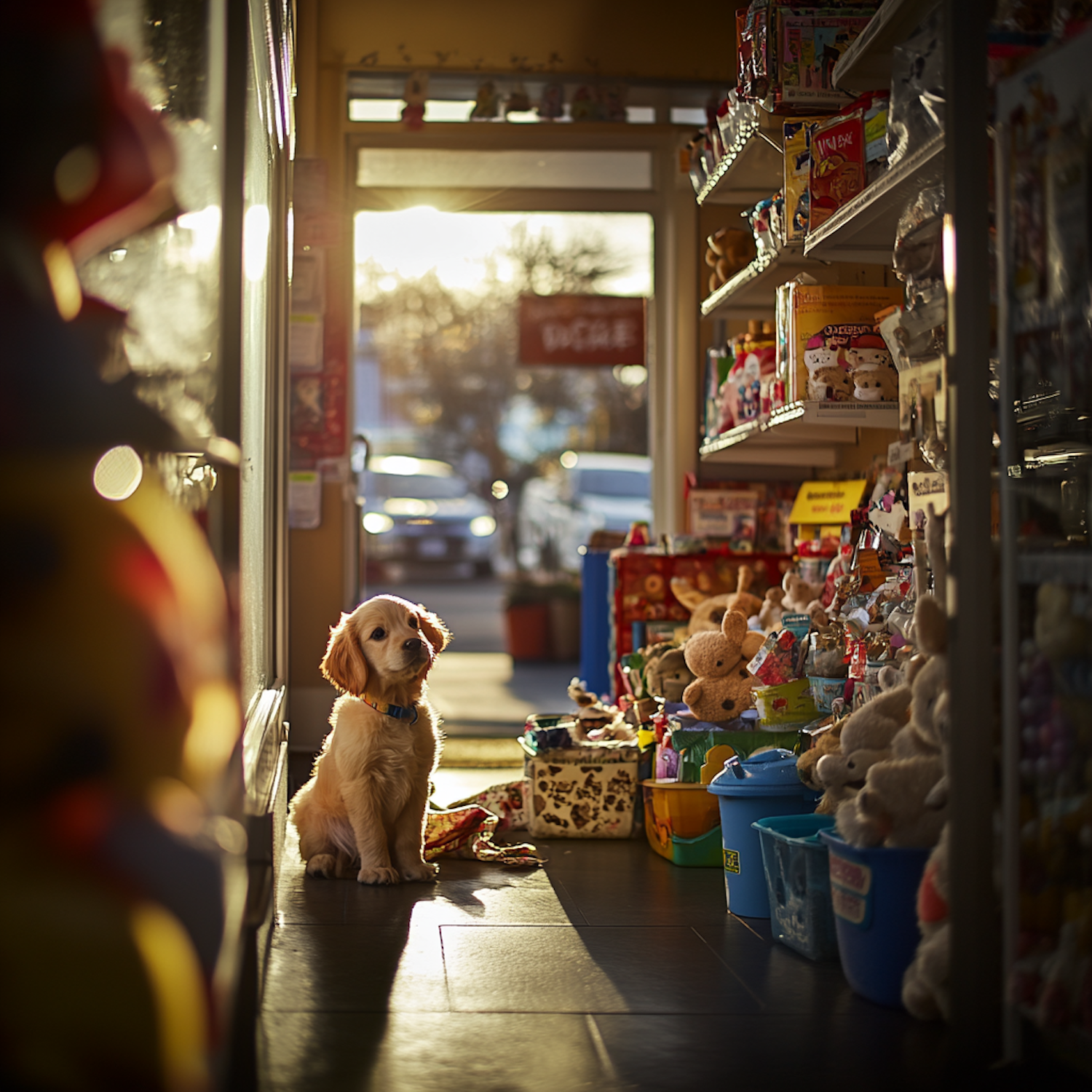 Golden retriever puppy in a toy store aisle, surrounded by colorful toys and warm sunlight streaming through the entrance.
