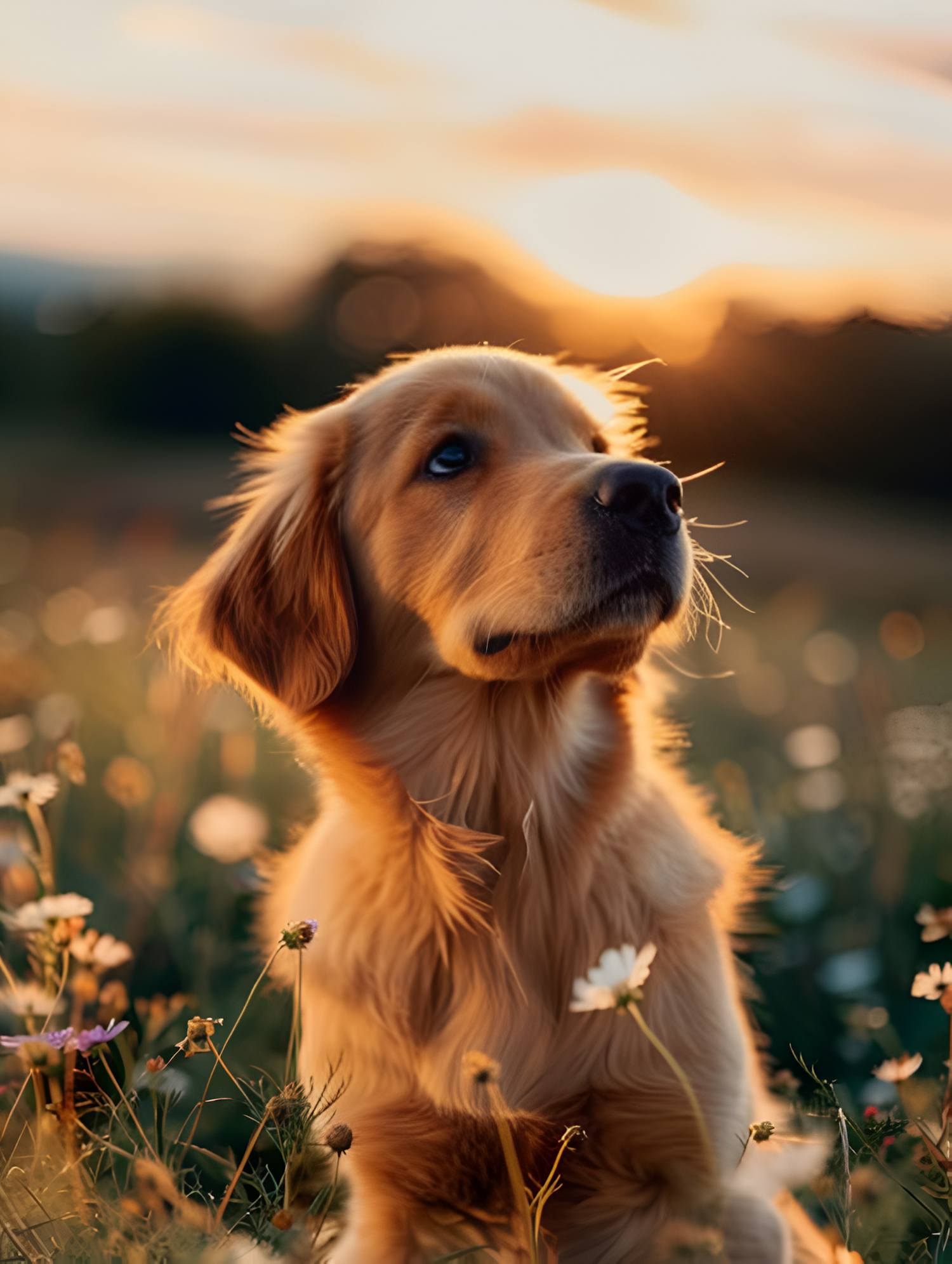 Golden retriever puppy in a field of wildflowers at sunset, with warm golden fur and curious eyes, creating a serene and picturesque scene.