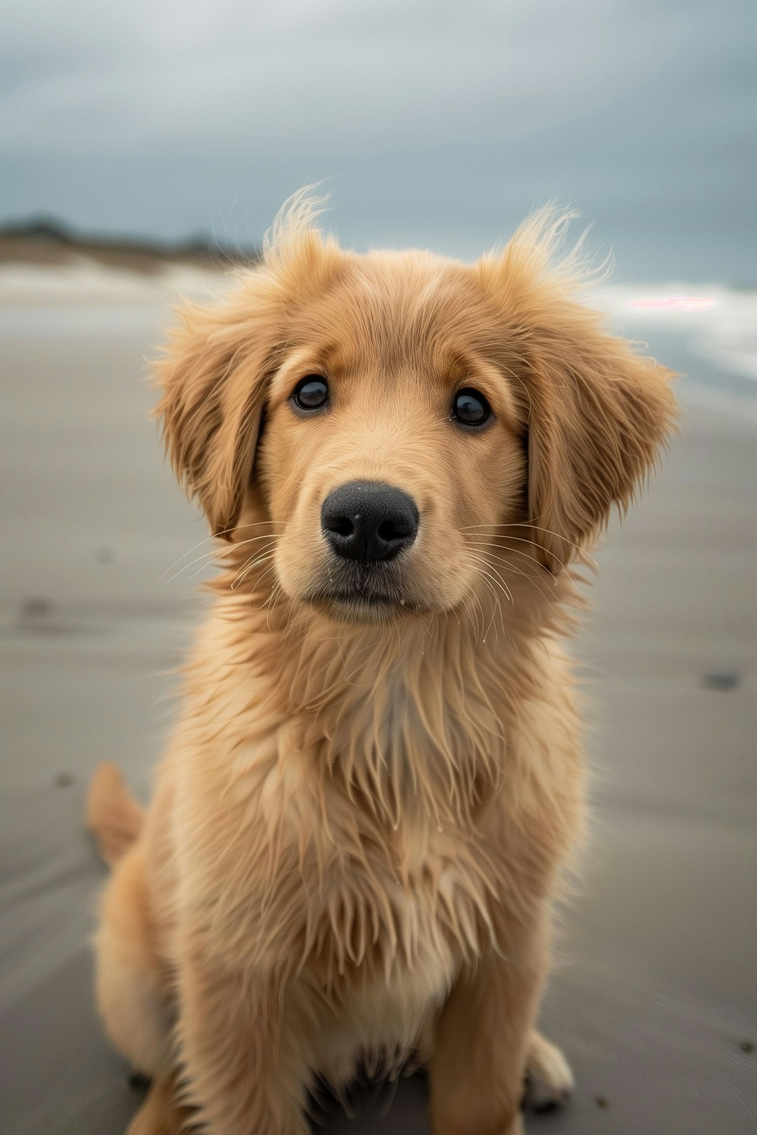 Adorable golden retriever puppy on a beach, with fluffy fur and curious eyes, set against a serene ocean backdrop.
