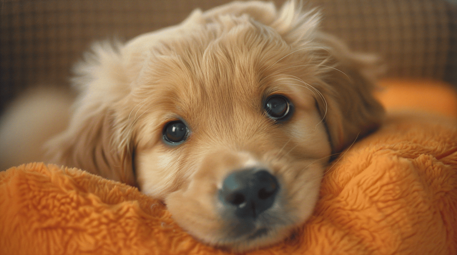Adorable golden retriever puppy resting on a bright orange blanket, showcasing its fluffy fur and expressive eyes.