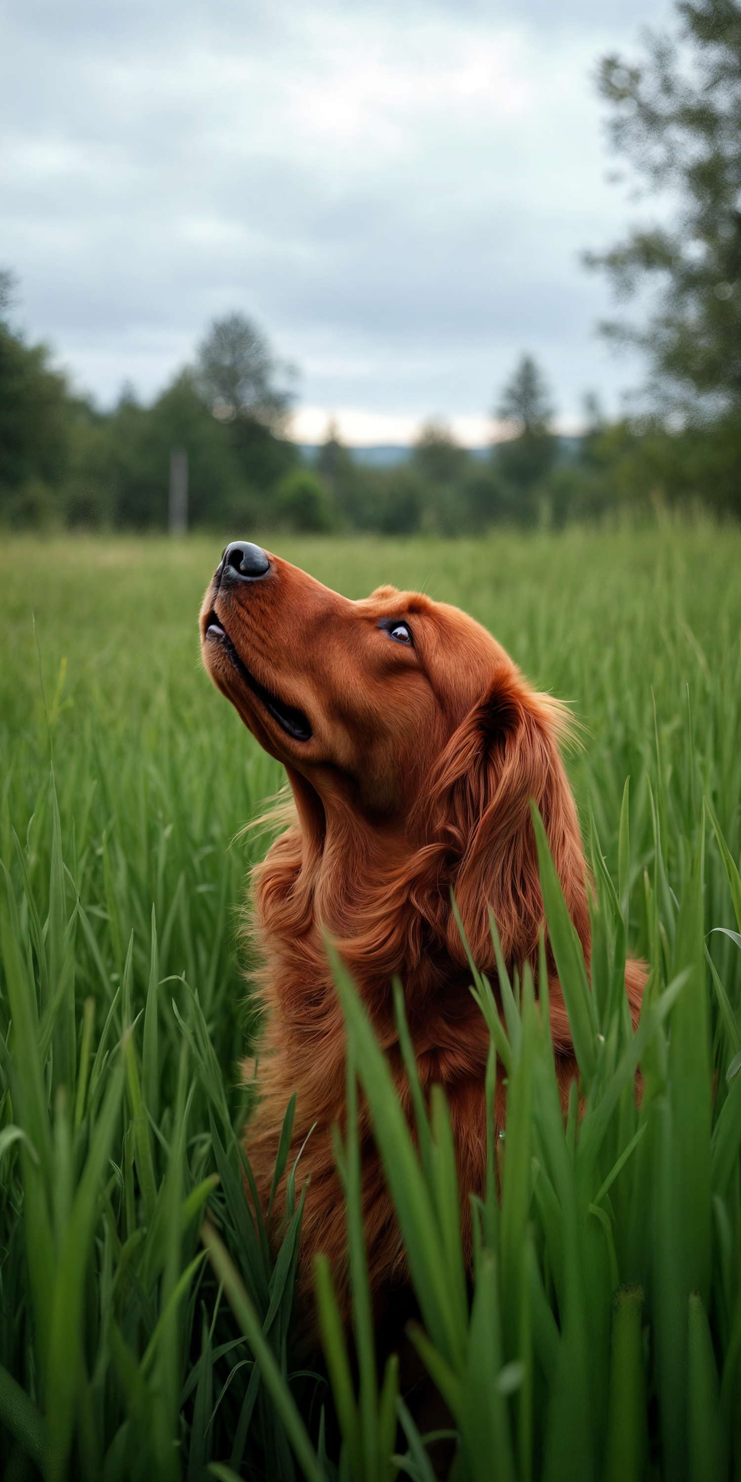 A golden retriever with a reddish coat sits in tall green grass, gazing upwards against a backdrop of trees and a cloudy sky.