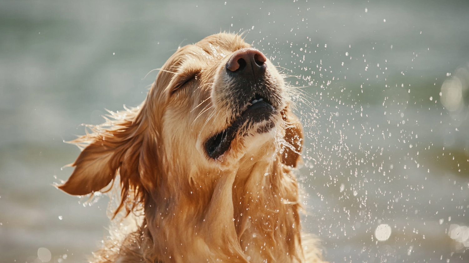 Golden retriever shaking off water, droplets flying, with a blurred water background. Sunlight highlights the dog's wet, golden fur.