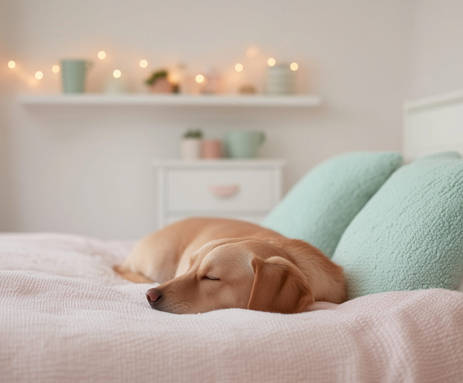 Golden retriever puppy sleeping on a pastel-colored bed with mint green pillows and warm fairy lights in a cozy room.