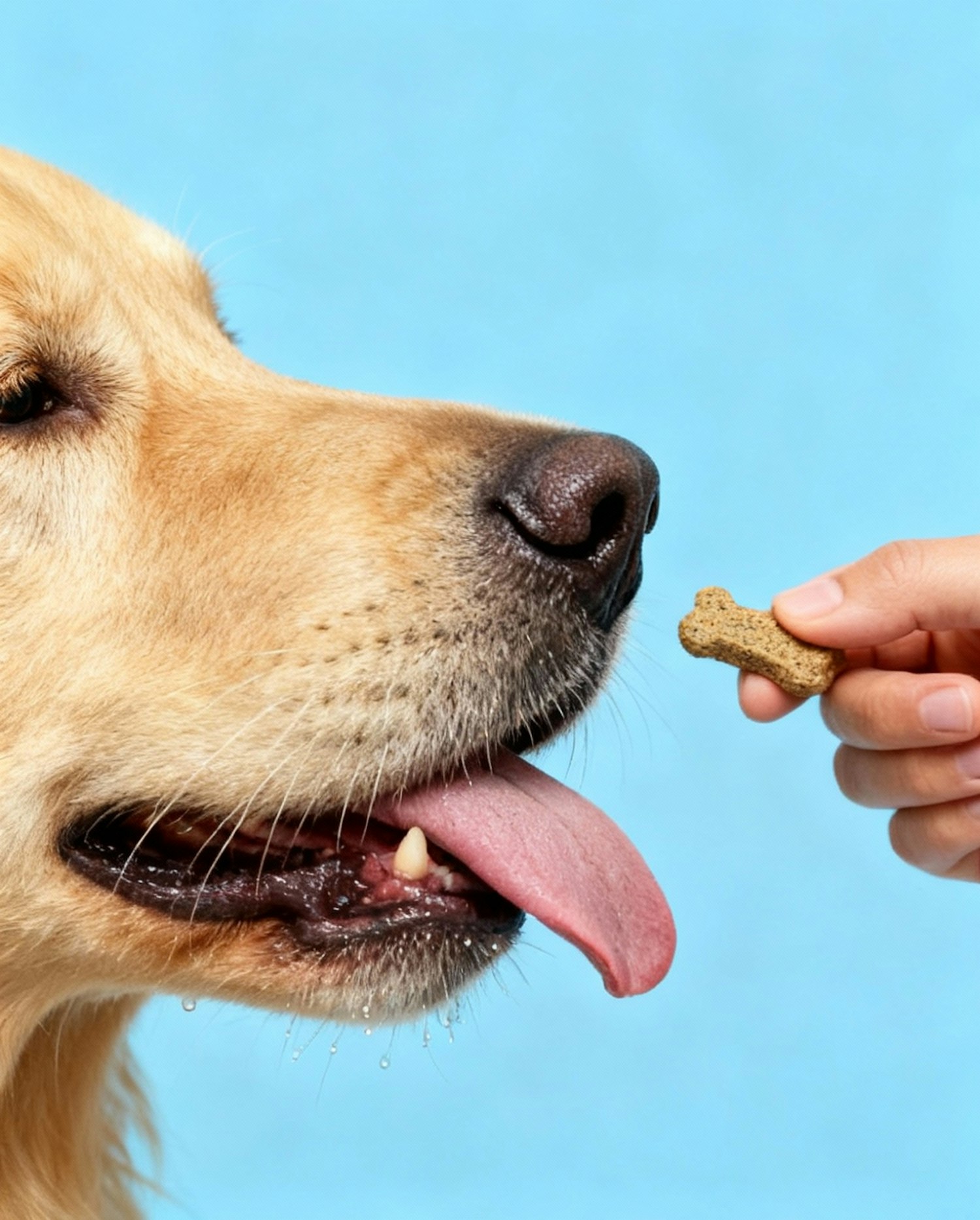 A golden retriever eagerly reaches for a bone-shaped treat held by a hand, set against a bright blue background.