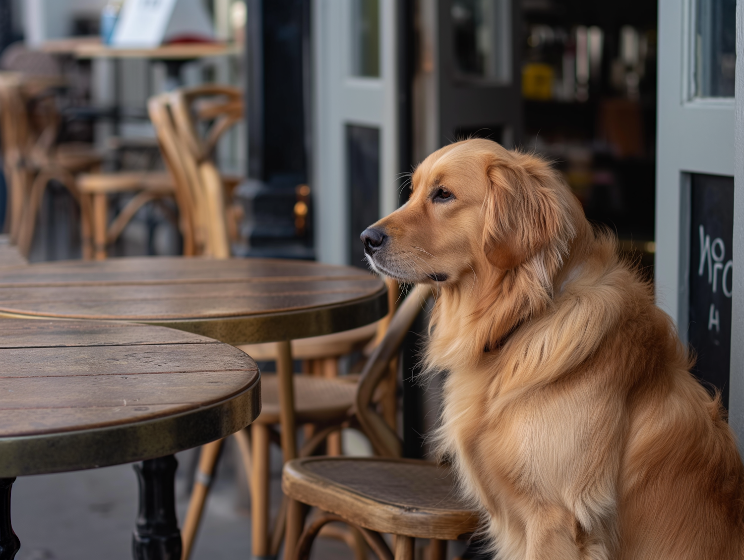 Golden retriever sitting outside a café, surrounded by wooden tables and chairs, exuding calmness and attentiveness.