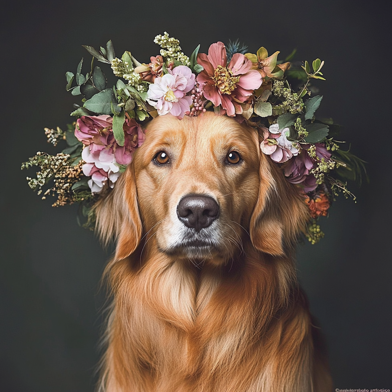 Golden retriever adorned with a vibrant floral crown, set against a dark green background, exuding elegance and charm.