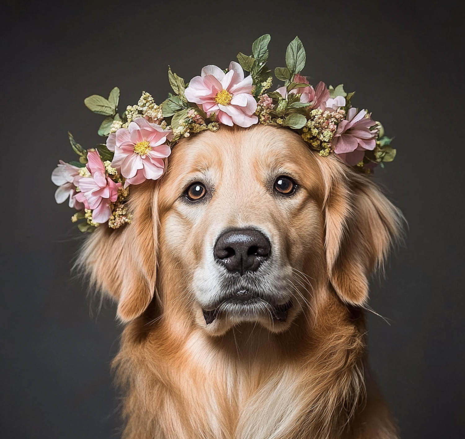 Golden retriever with a floral crown, featuring pink and white flowers, against a gray background. Whimsical and serene portrait.