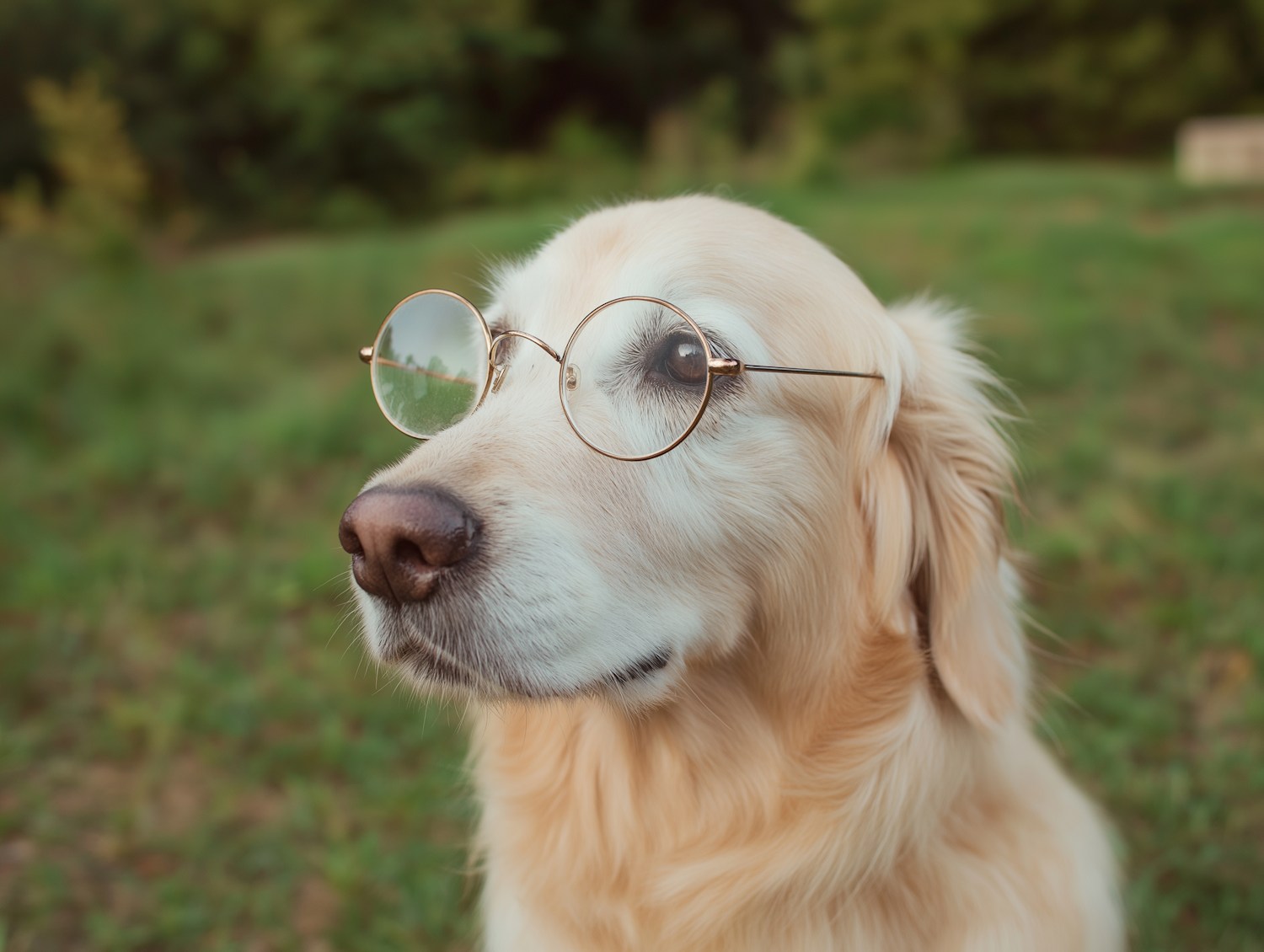 Golden retriever wearing round glasses sitting on a grassy outdoor setting, embracing an adorable and intellectual vibe.