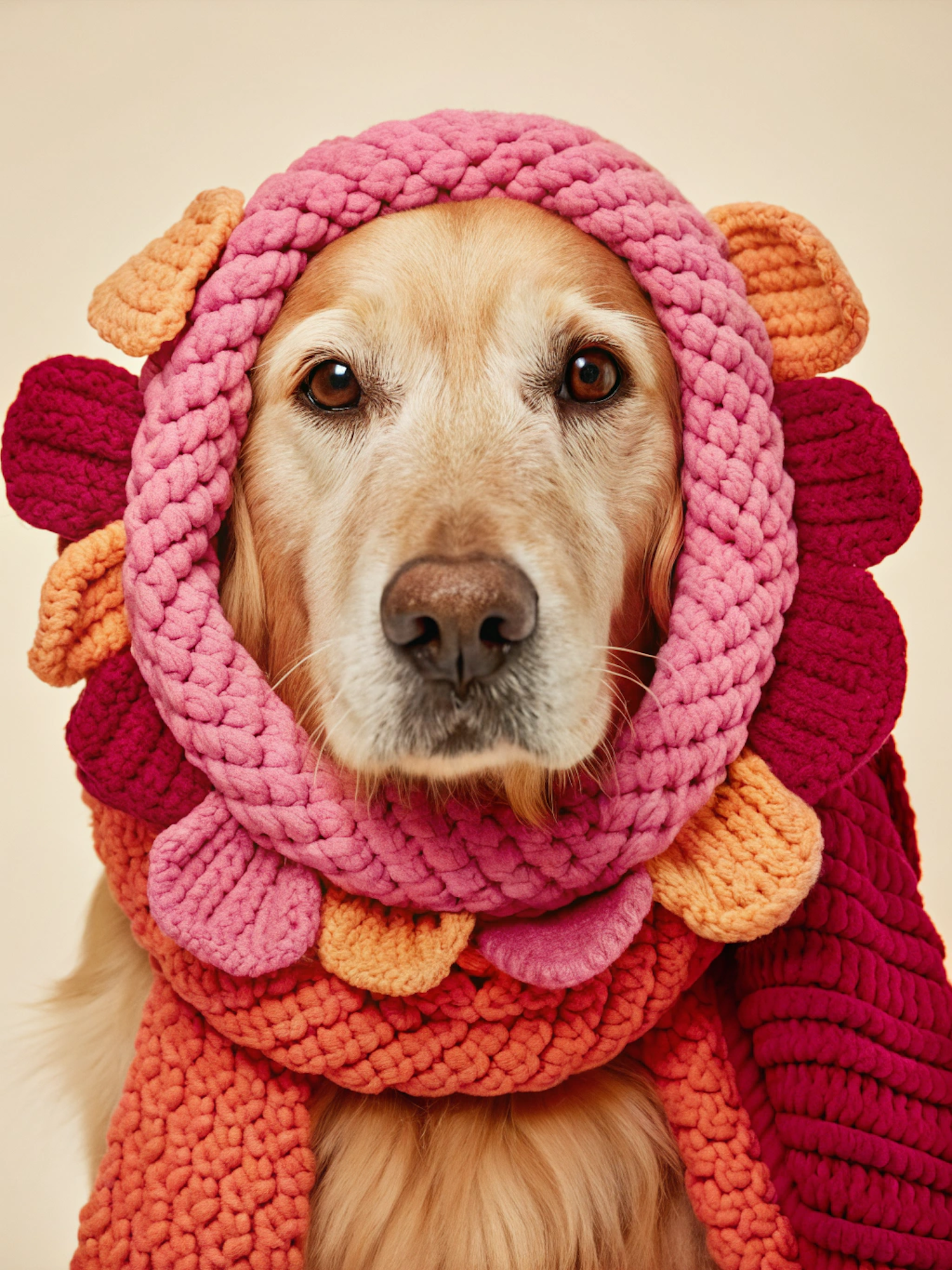 Golden retriever in a colorful knitted scarf with flower petal design, set against a neutral beige background.