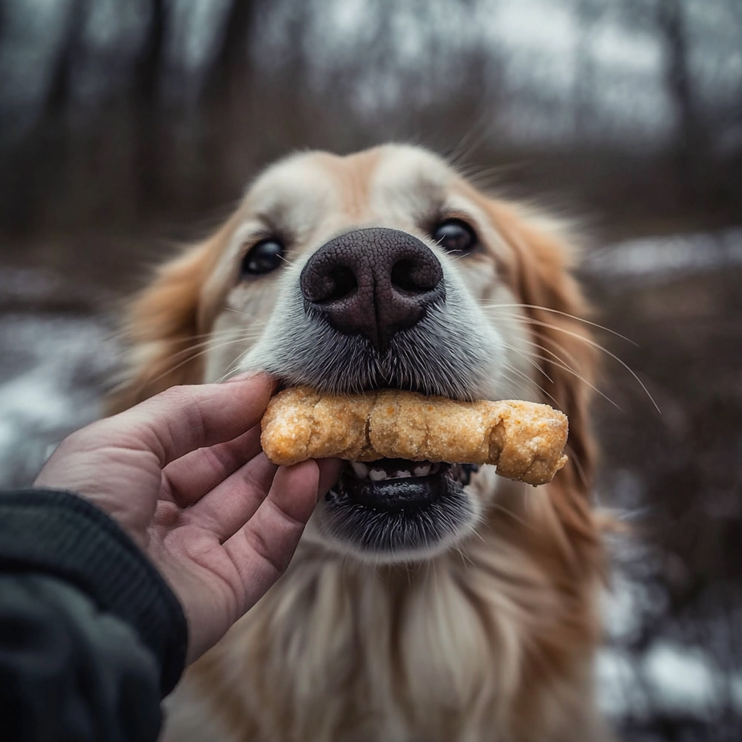 Golden retriever eagerly holds a treat in its mouth, with a human hand offering it. Outdoor setting with blurred background.