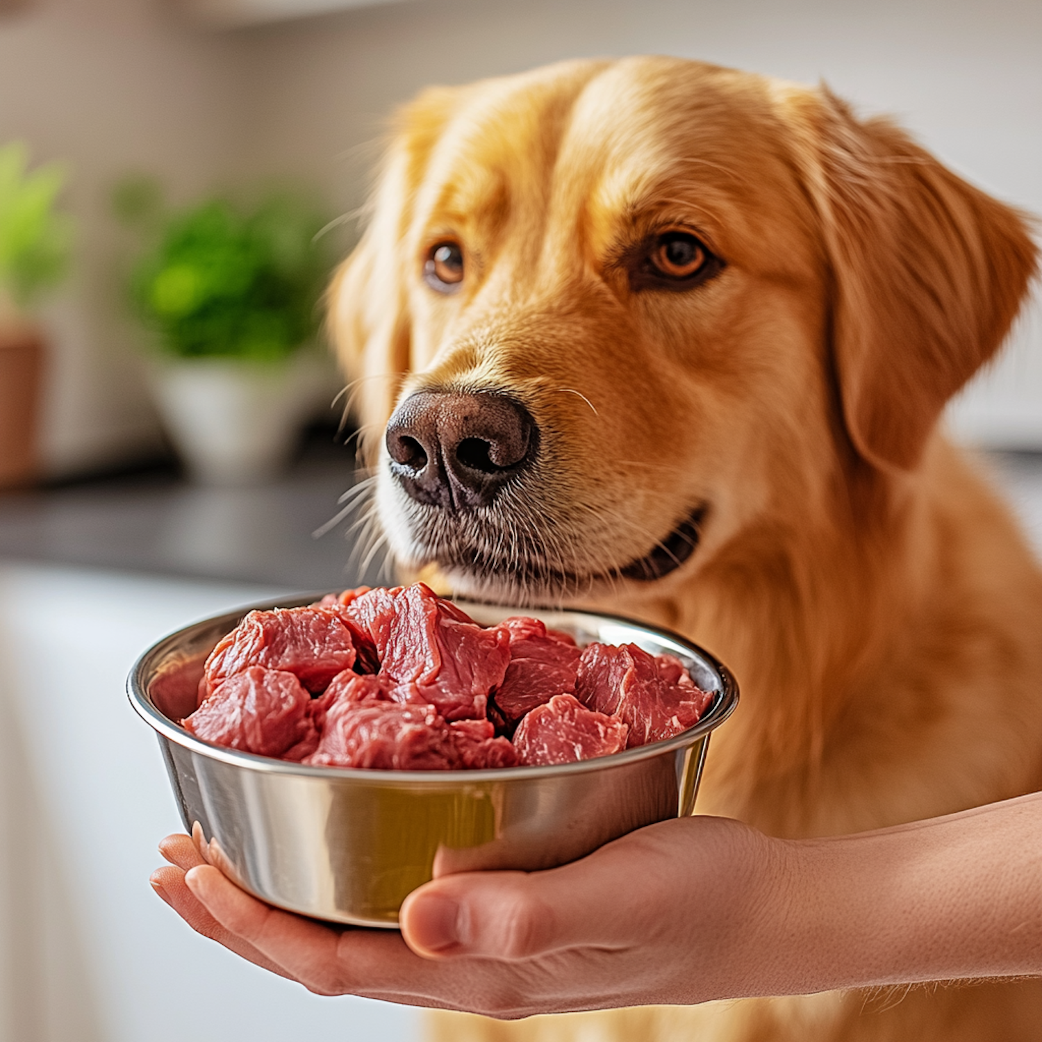 Golden retriever eagerly eyes a bowl of raw meat in a kitchen setting, showcasing anticipation and interest.