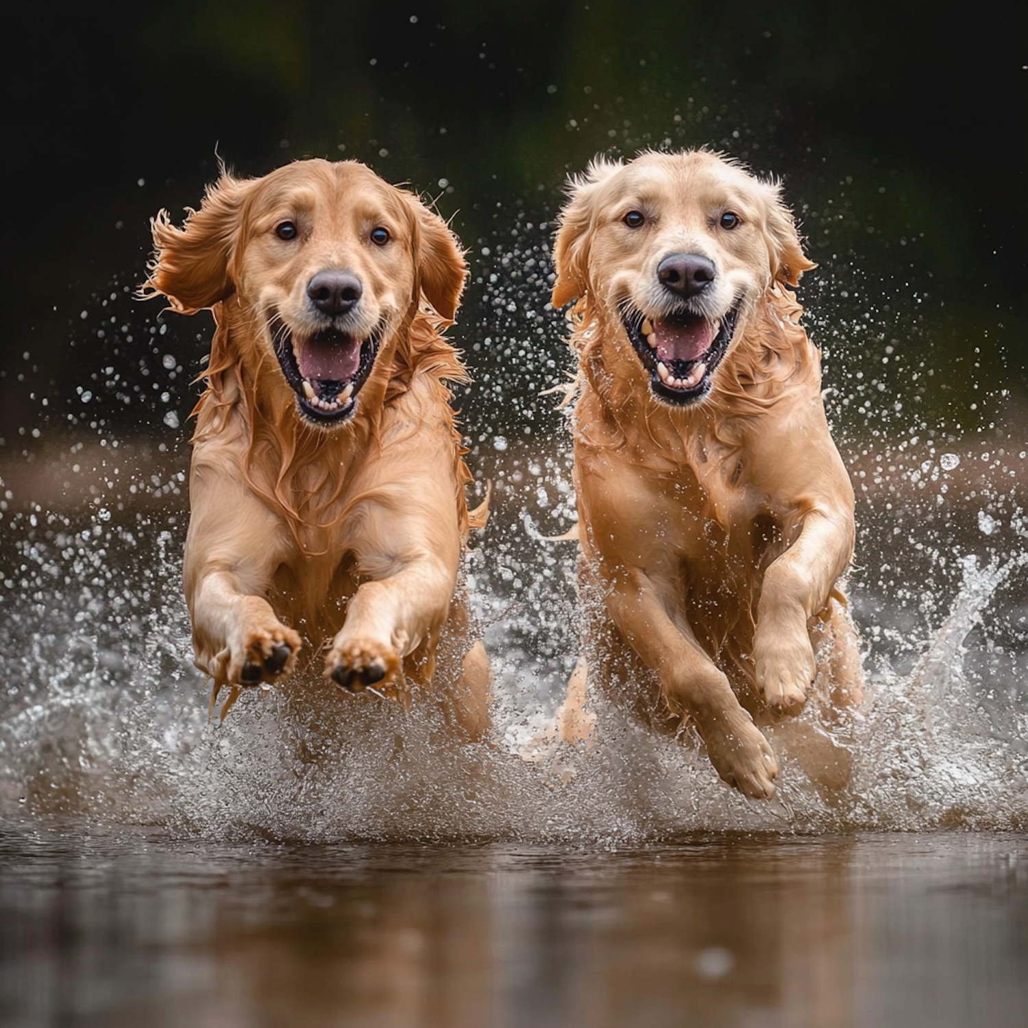 Two golden retrievers joyfully splash through water, their wet fur glistening as they run energetically, capturing a moment of pure joy.