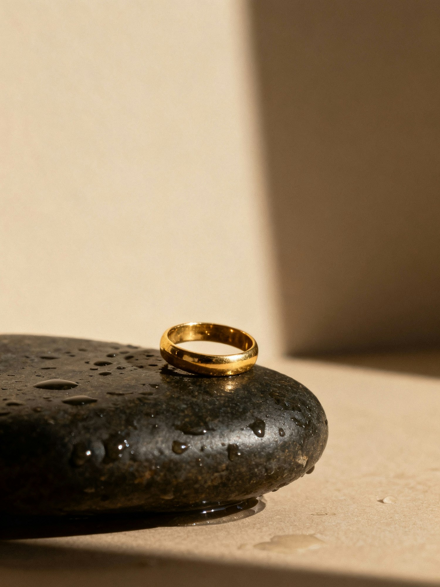 A golden ring on a wet stone, illuminated by warm light against a beige background, creating a serene and minimalist composition.