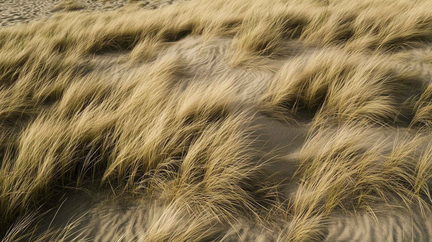 Golden grass sways over sand dunes, creating a serene and textured natural landscape with light and shadow interplay.