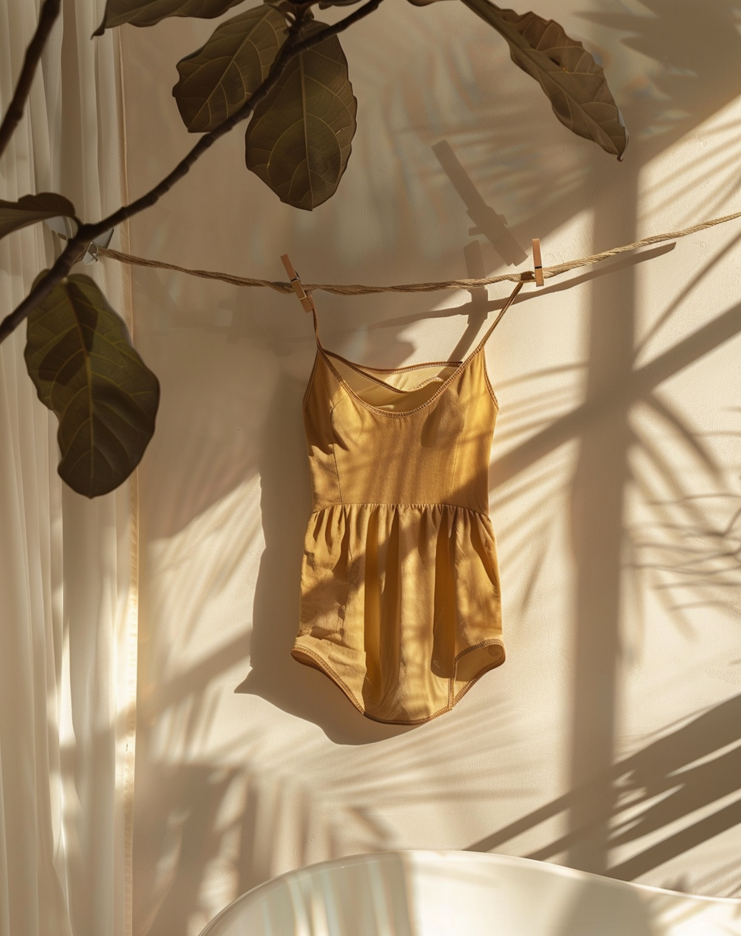 Mustard yellow dress hanging in sunlight with leafy shadows on a cream wall, creating a serene and natural ambiance.