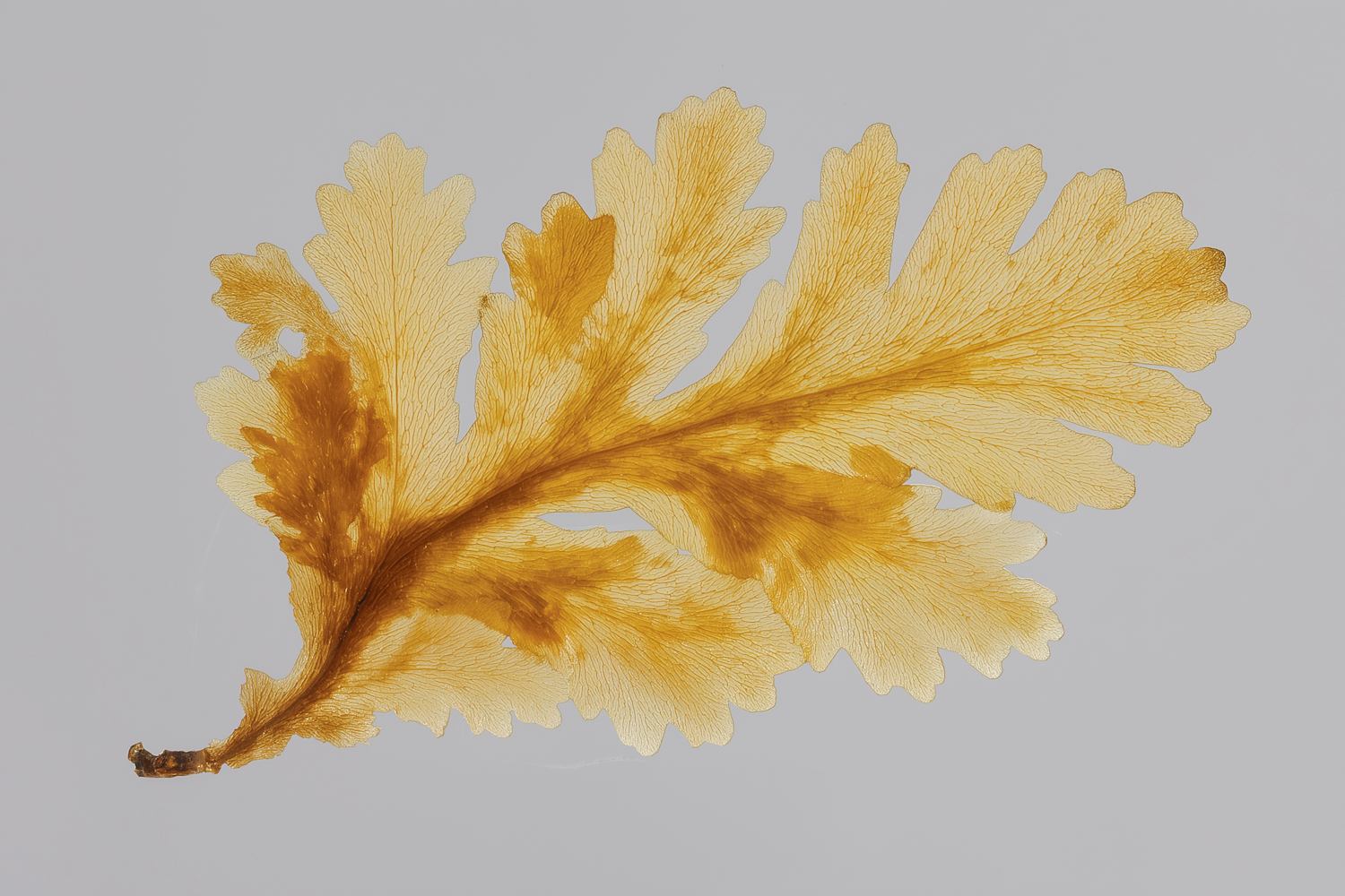 Golden-brown translucent seaweed frond with intricate vein patterns on a light gray background, showcasing its delicate, lacy structure.