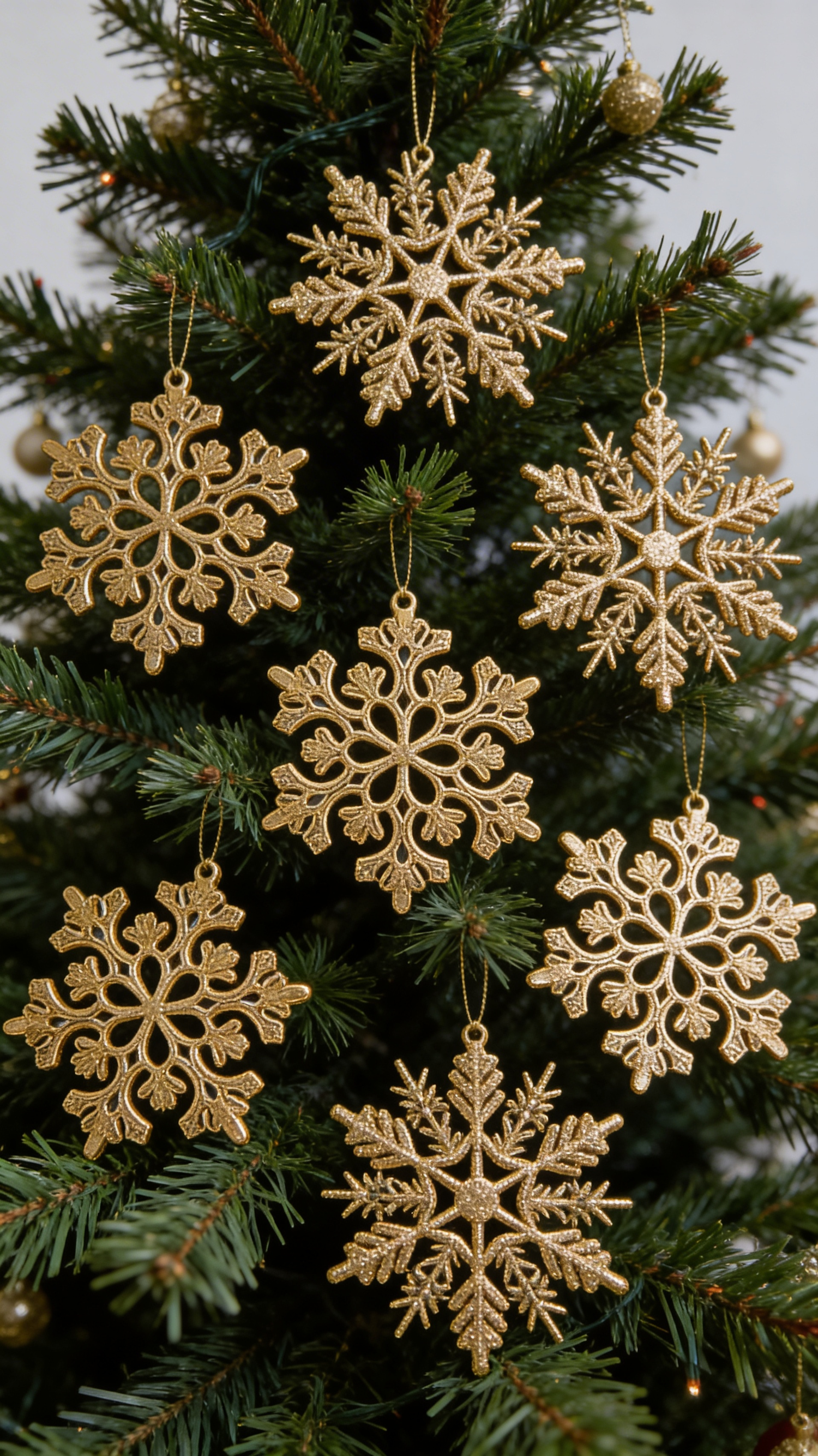 Golden snowflake ornaments on a lush green Christmas tree, creating a festive and elegant holiday atmosphere.