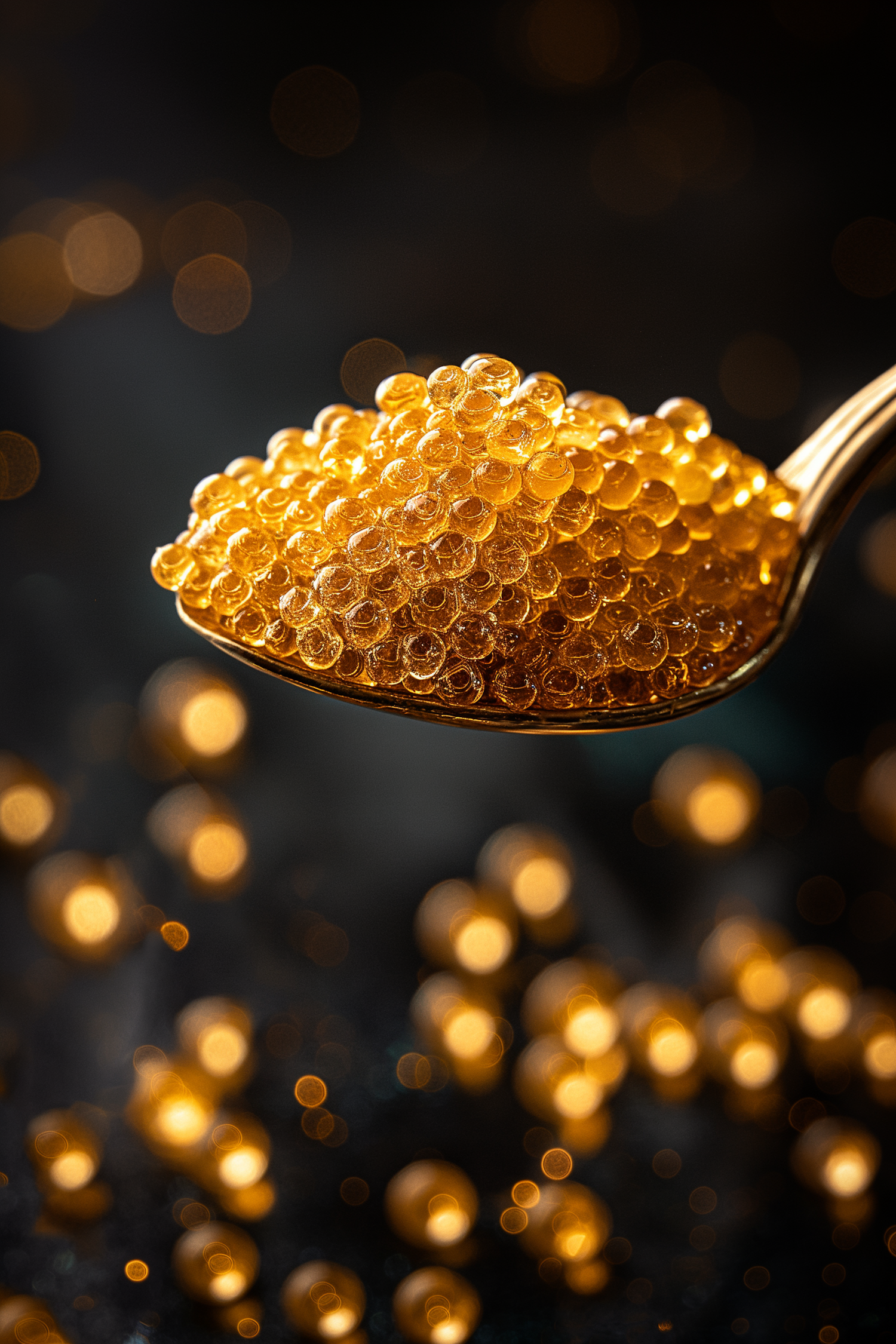 Luxurious golden spheres on a spoon, resembling caviar, with a blurred background for an opulent look.