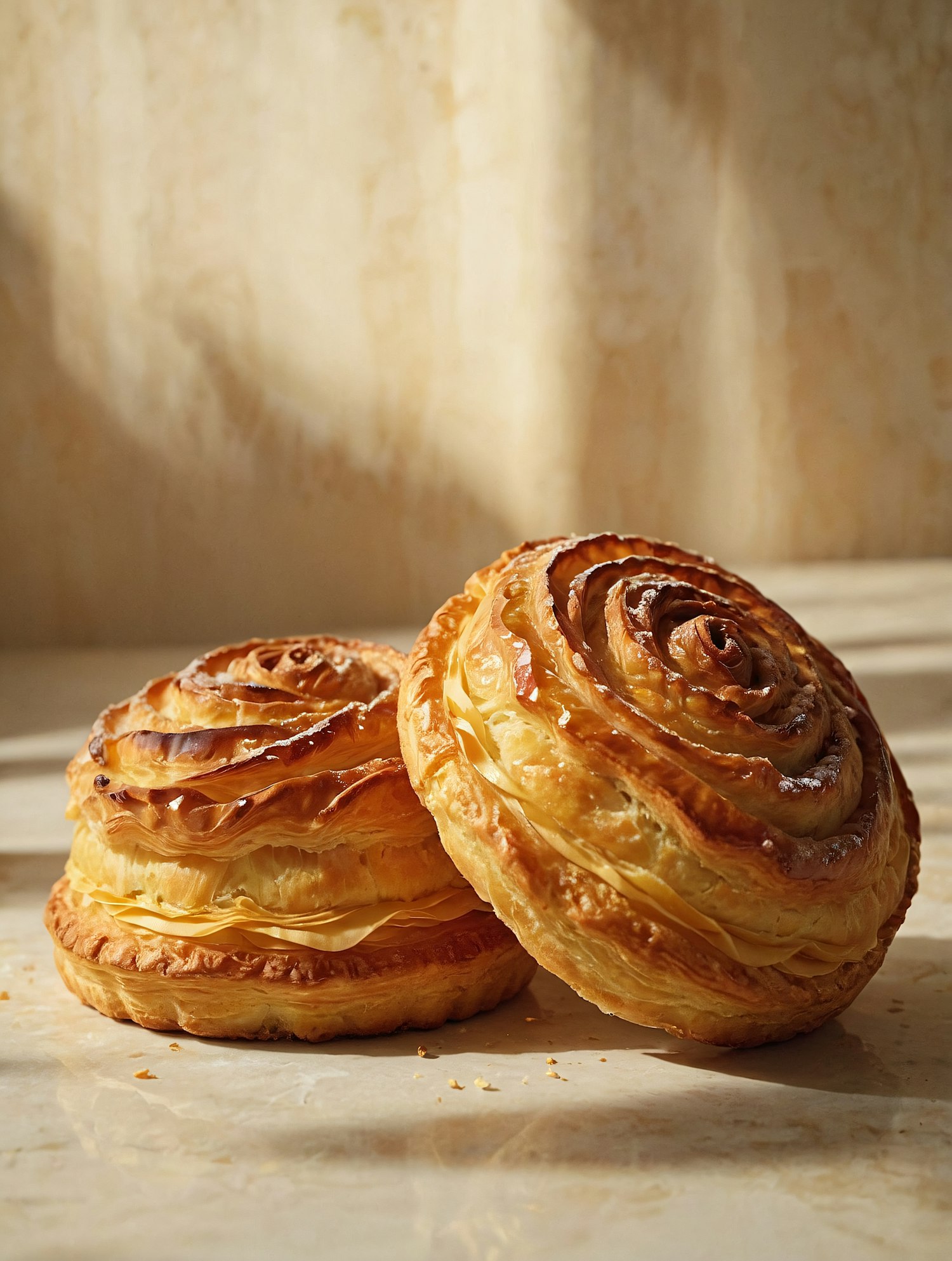Golden-brown spiral pastries with flaky layers on a marble surface, beautifully lit with warm tones and a glossy finish.