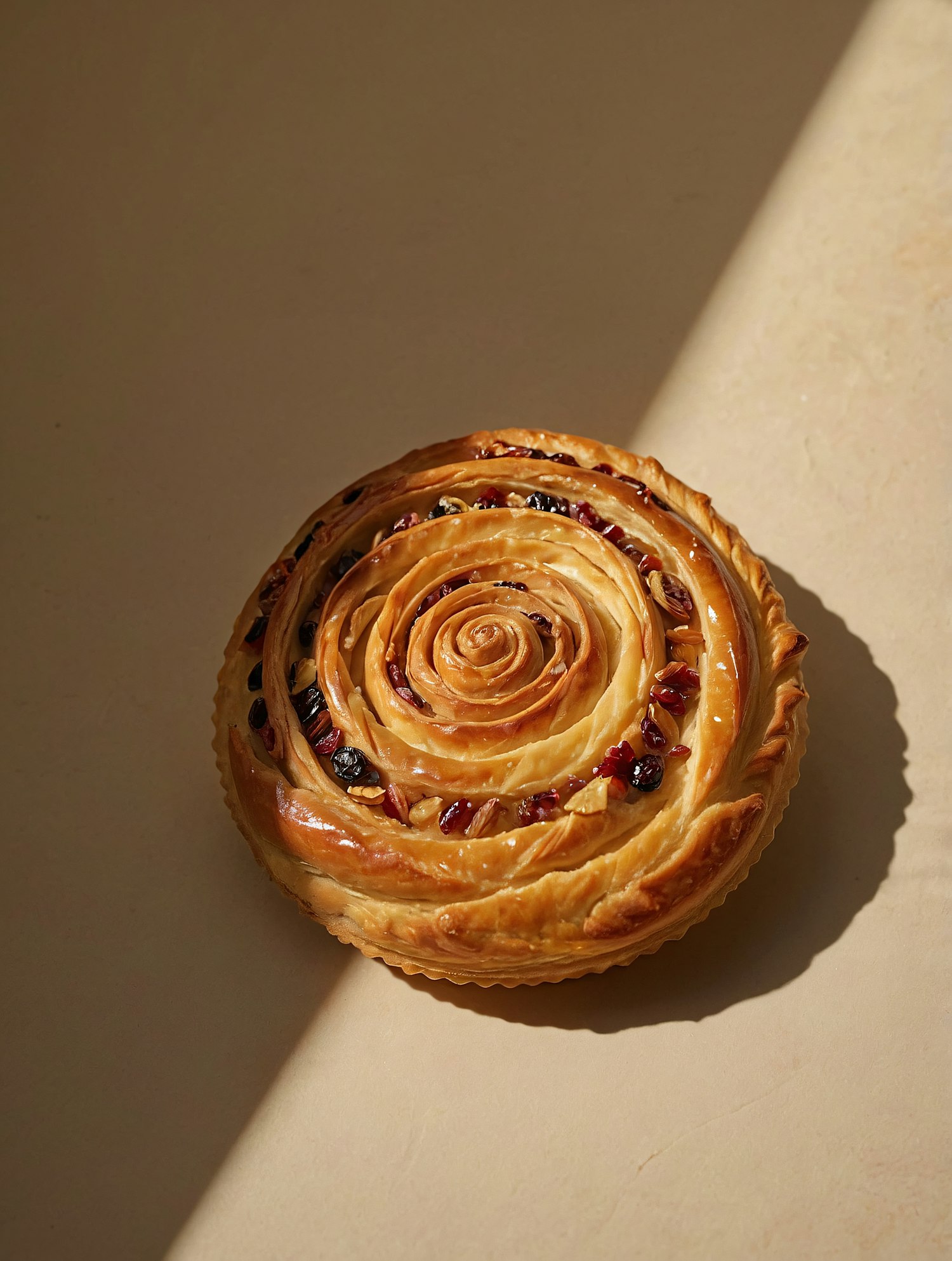 Golden spiral pastry with dried fruits like cranberries and raisins, baked to perfection and illuminated by soft sunlight on a beige surface.