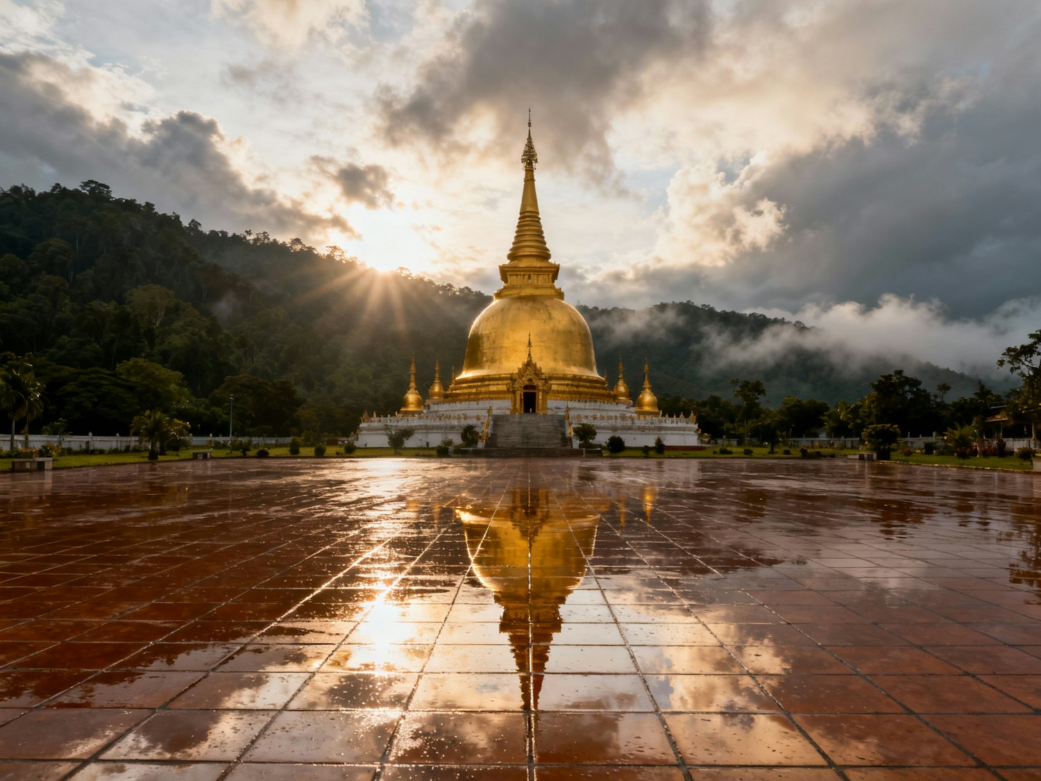 Golden stupa reflecting on a wet tiled courtyard, surrounded by lush greenery and misty hills under a dramatic cloudy sky.