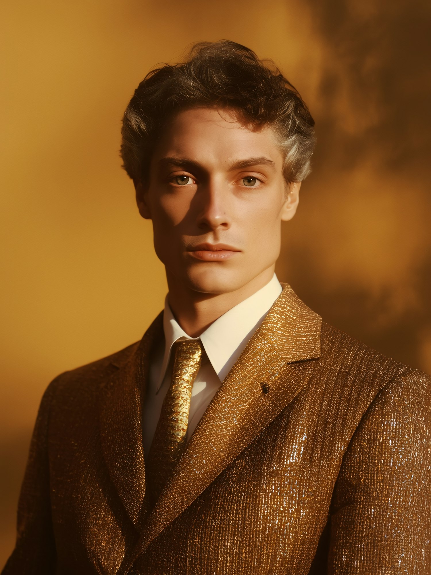 A person in a shimmering gold suit with a white shirt and gold tie, set against a warm golden background, exuding elegance.