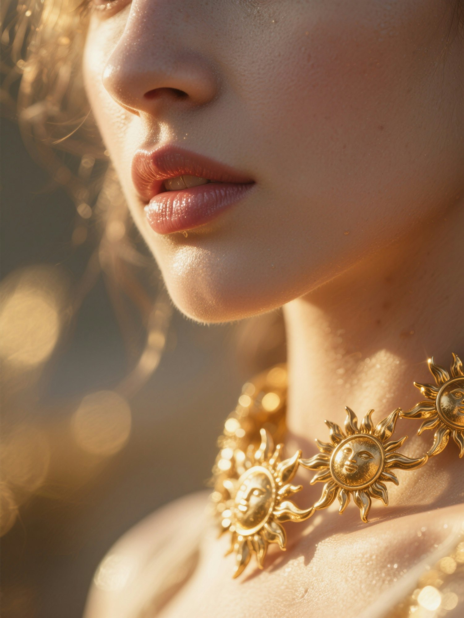 Close-up of a golden sun-themed necklace on a dewy skin background, bathed in warm sunlight, highlighting intricate details.