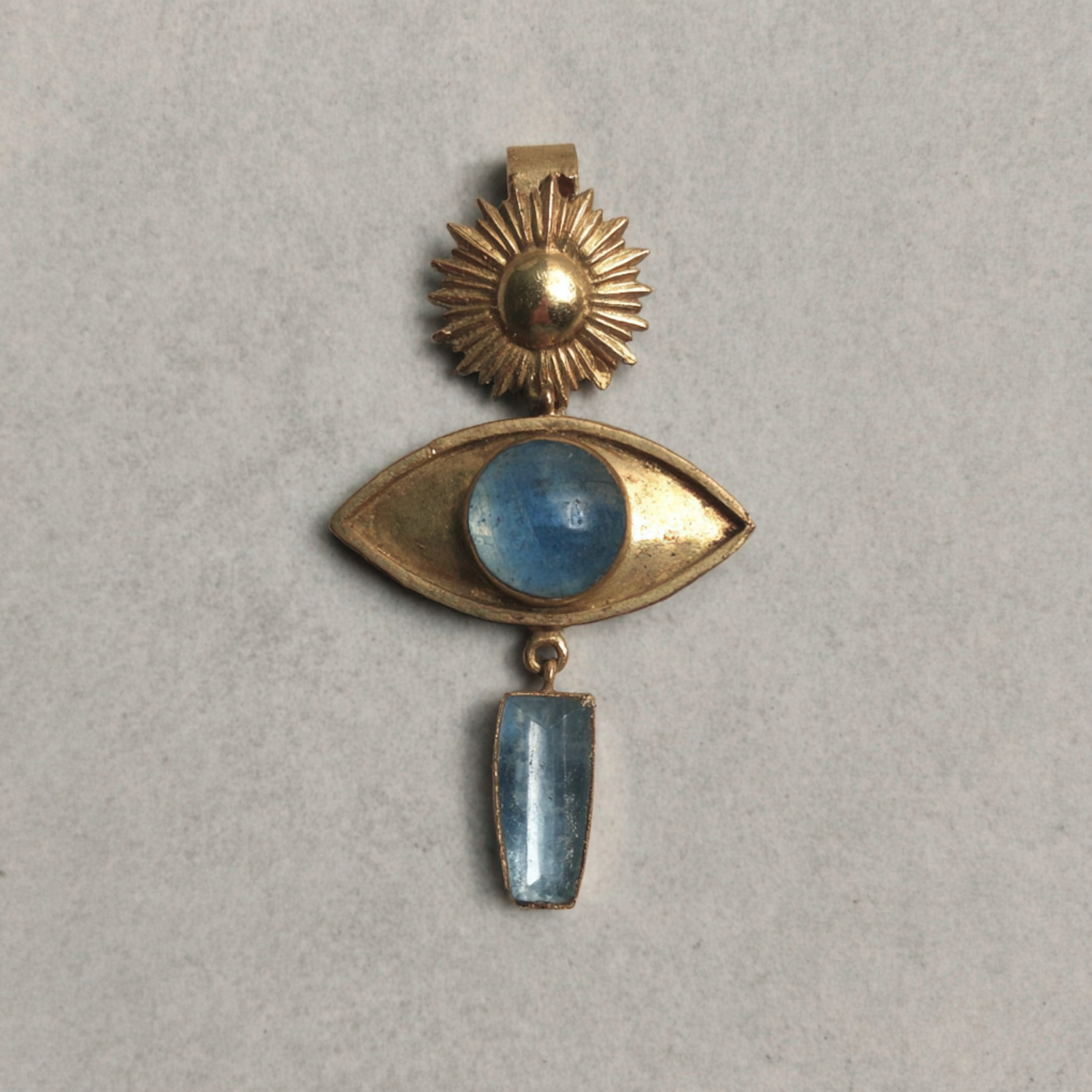 A unique gold pendant with a sunburst, an eye-shaped design with a blue gem, and a dangling rectangular blue stone.