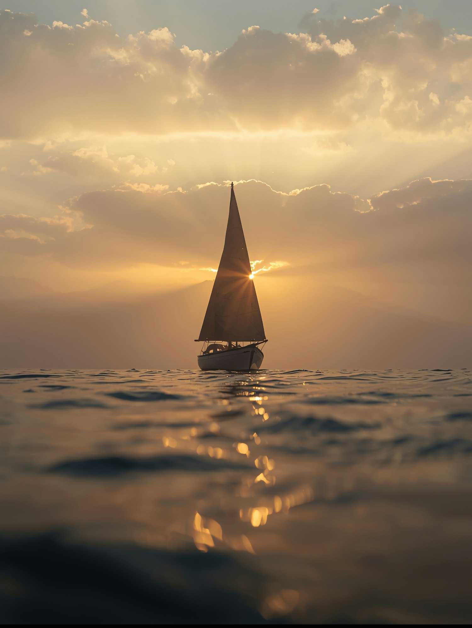 A sailboat silhouetted against a golden sunset, with rippling water reflecting the warm hues and rays of sunlight streaming through clouds.
