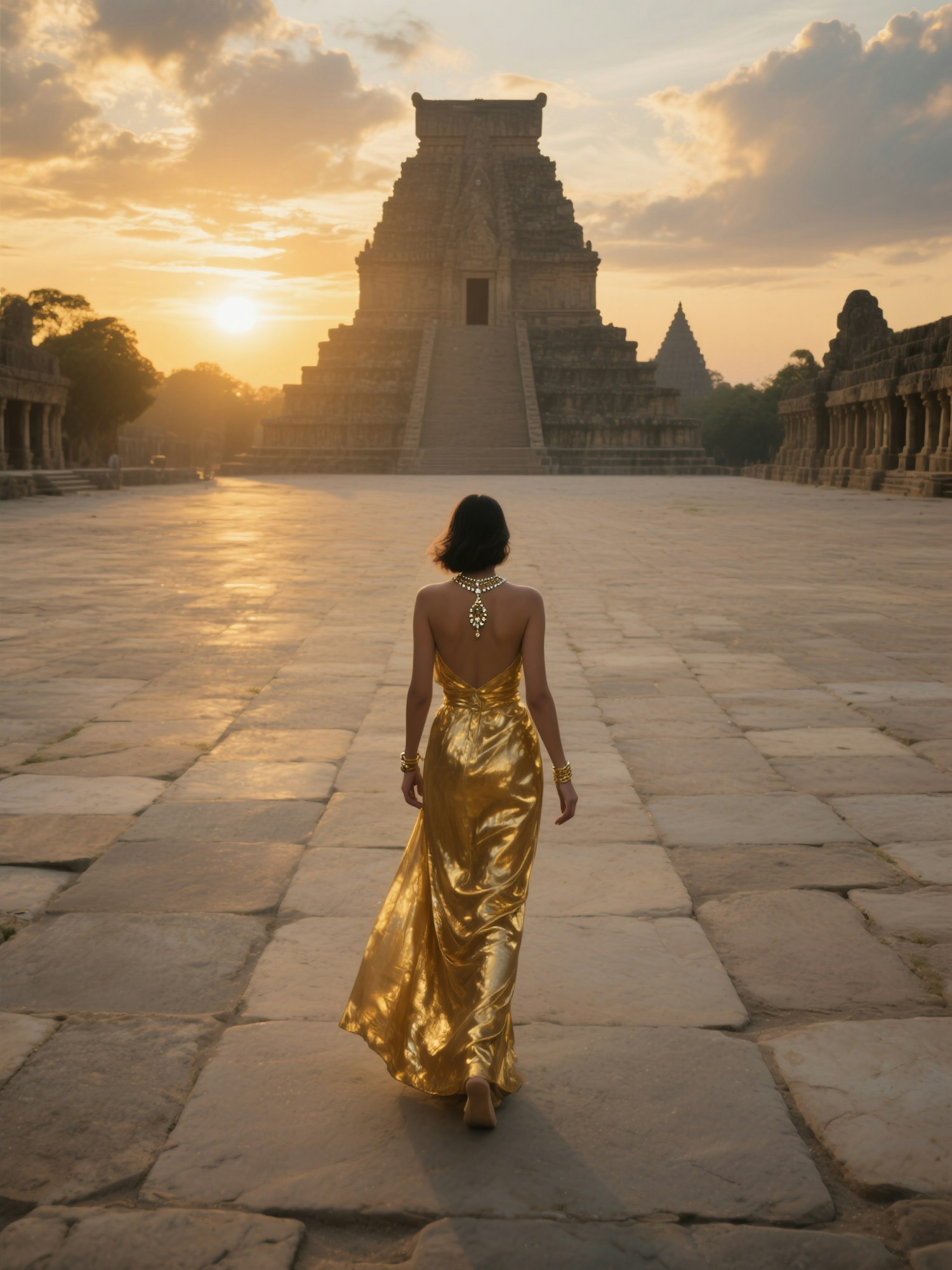A woman in a golden dress walks towards an ancient temple at sunset, with warm light reflecting off her attire and the stone courtyard.