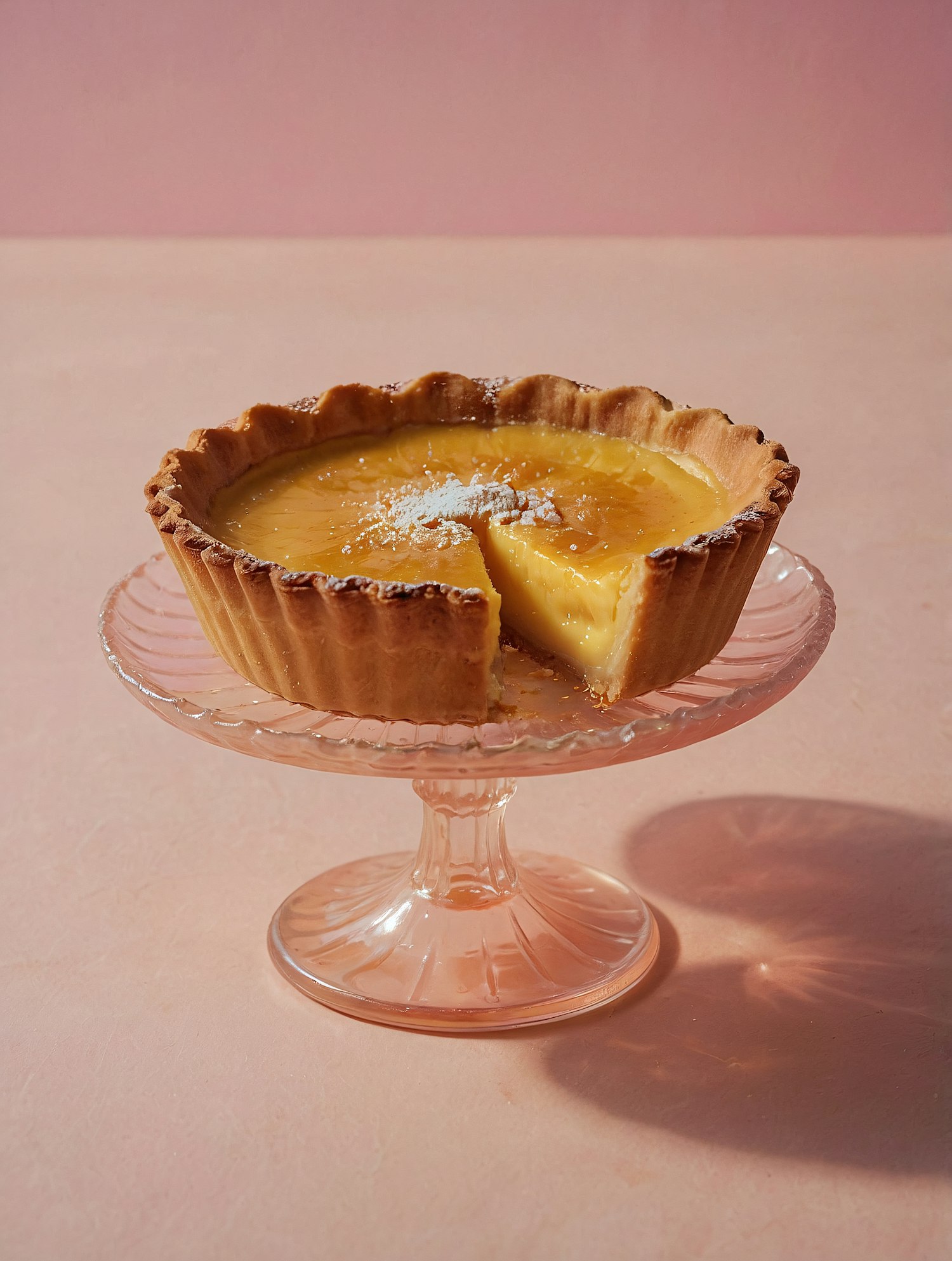 A golden yellow tart with a creamy filling on a pink glass stand, set against a soft pink background. Perfect for dessert lovers!