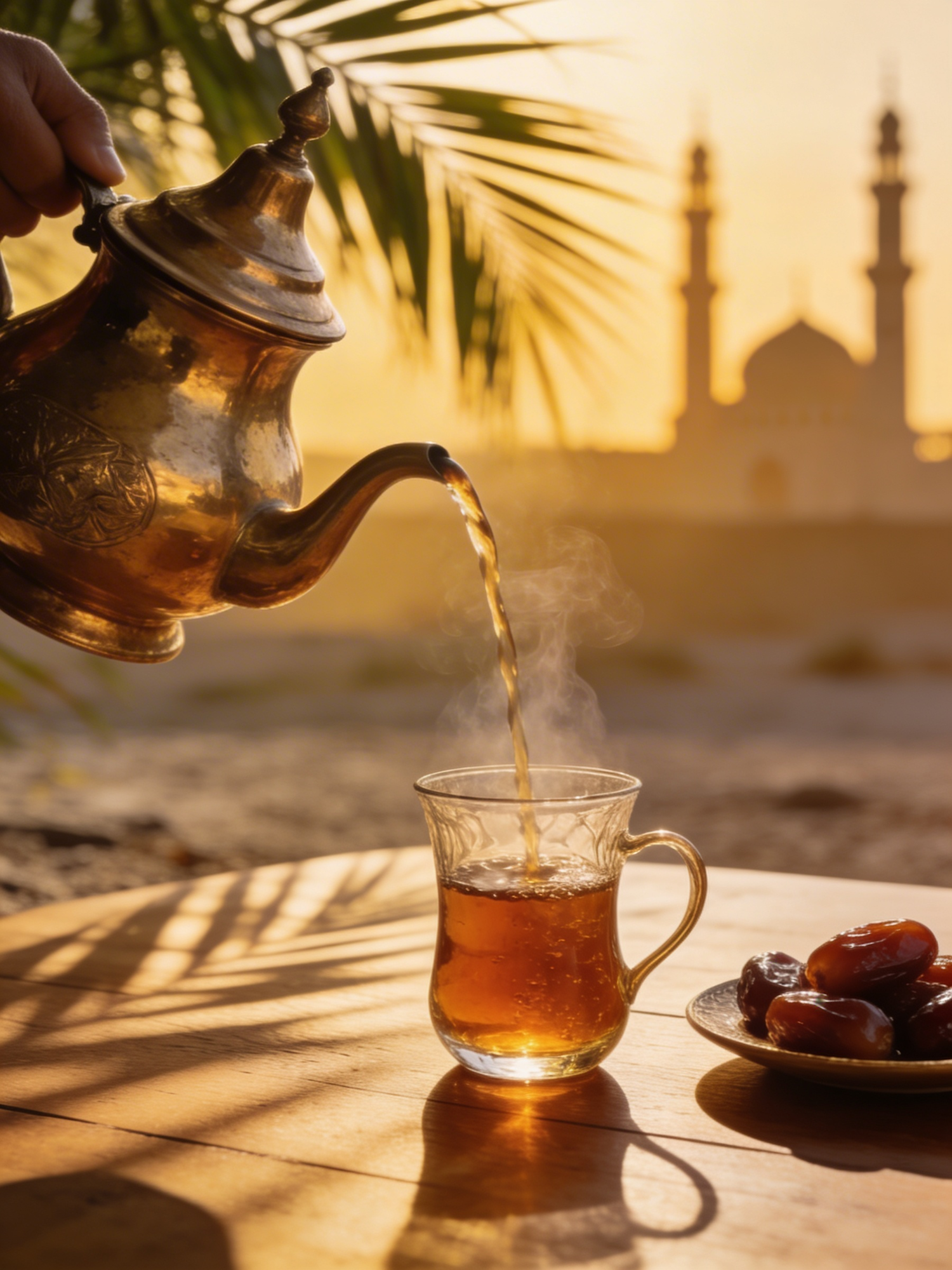 A high‑definition editorial Ramadan scene. A brass teapot pours tea into a small cup on a wooden surface, with a plate of dates nearby. Soft shadows of palm leaves and distant minarets fall across the background, creating a warm, atmospheric moment. Minimal, serene, no text, no logos.