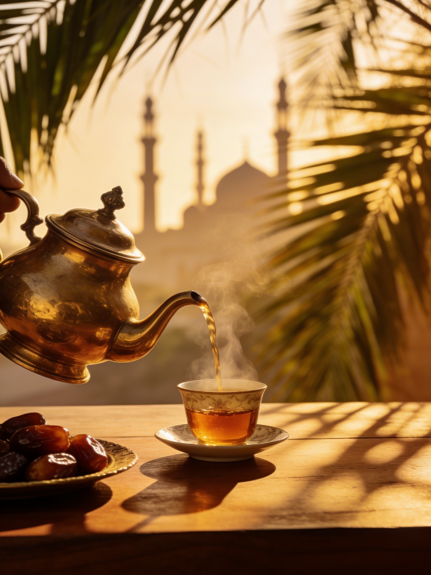 Golden teapot pouring tea into a cup with dates nearby, set against a mosque silhouette and palm shadows in warm sunlight.