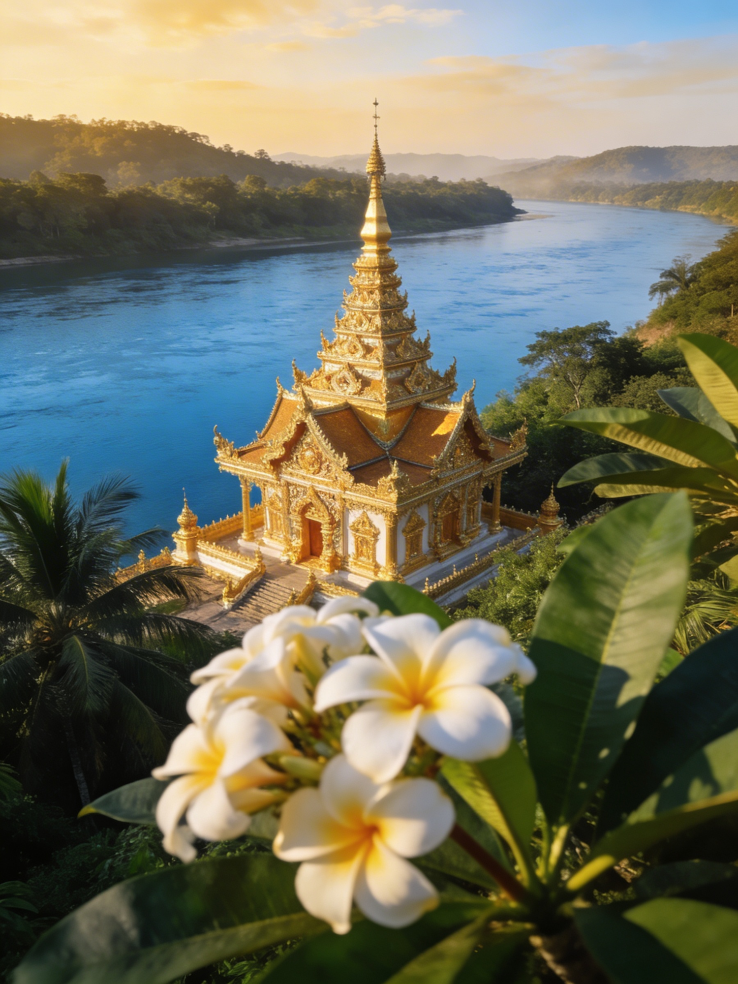 Ultra-realistic high-resolution travel photograph from a slightly elevated perspective, capturing an iconic Laotian landscape with frangipani blossoms and tropical greenery in the foreground, a golden-roofed Buddhist temple near the Mekong River, and soft forested hills fading into the distance. Warm golden-hour sunlight creates crisp highlights and realistic shadows across the temple details, tropical leaves, and calm river surface. The foreground is framed by softly out-of-focus frangipani branches and lush foliage, leading the eye toward the temple on the right and the river beyond. In the distance, low hills stretch beneath a pale gold and light blue sky. The overall palette is rich yet natural, with temple gold, tropical green, soft blossom ivory, river blue, and warm sunlight. Ultra-detailed, photorealistic, sharp textures, realistic atmospheric depth, natural color grading, editorial travel photography, shot on a full-frame camera, magazine-quality realism, no painting, no illustration, no CGI. Extremely realistic travel photography, crisp fine detail, realistic shadows, true-to-life color, sharp architectural textures, natural optical depth, high-resolution full-frame camera image.