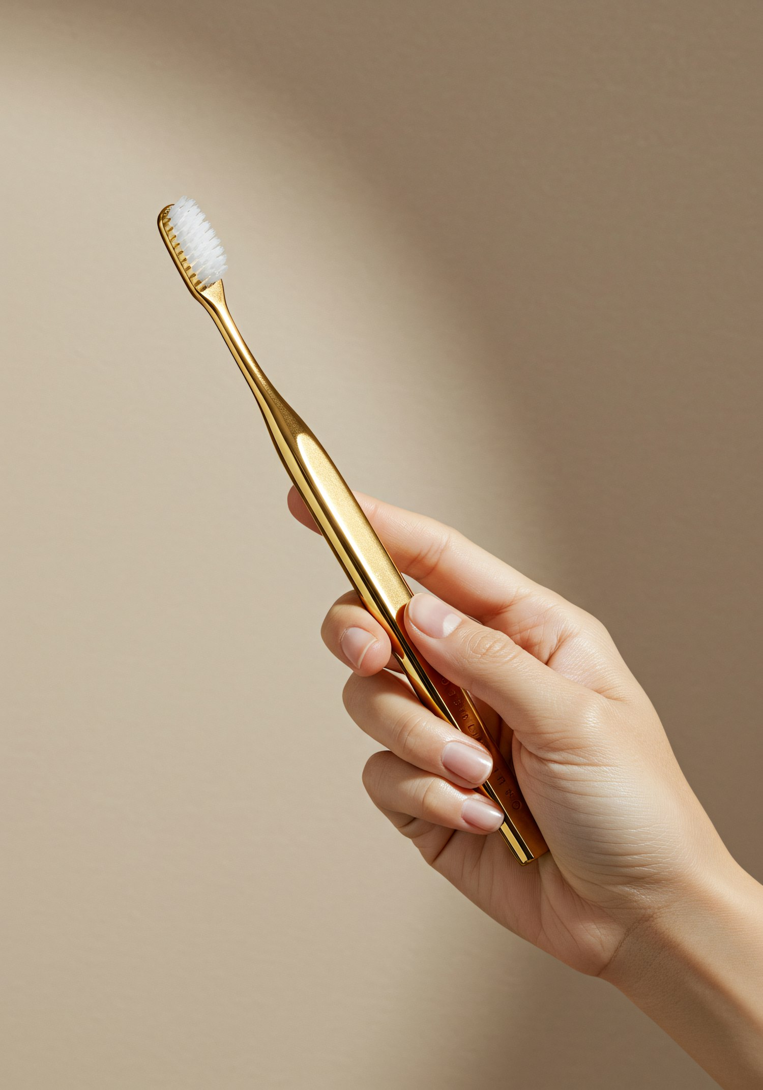A hand holding a sleek golden toothbrush with white bristles, set against a neutral beige background.