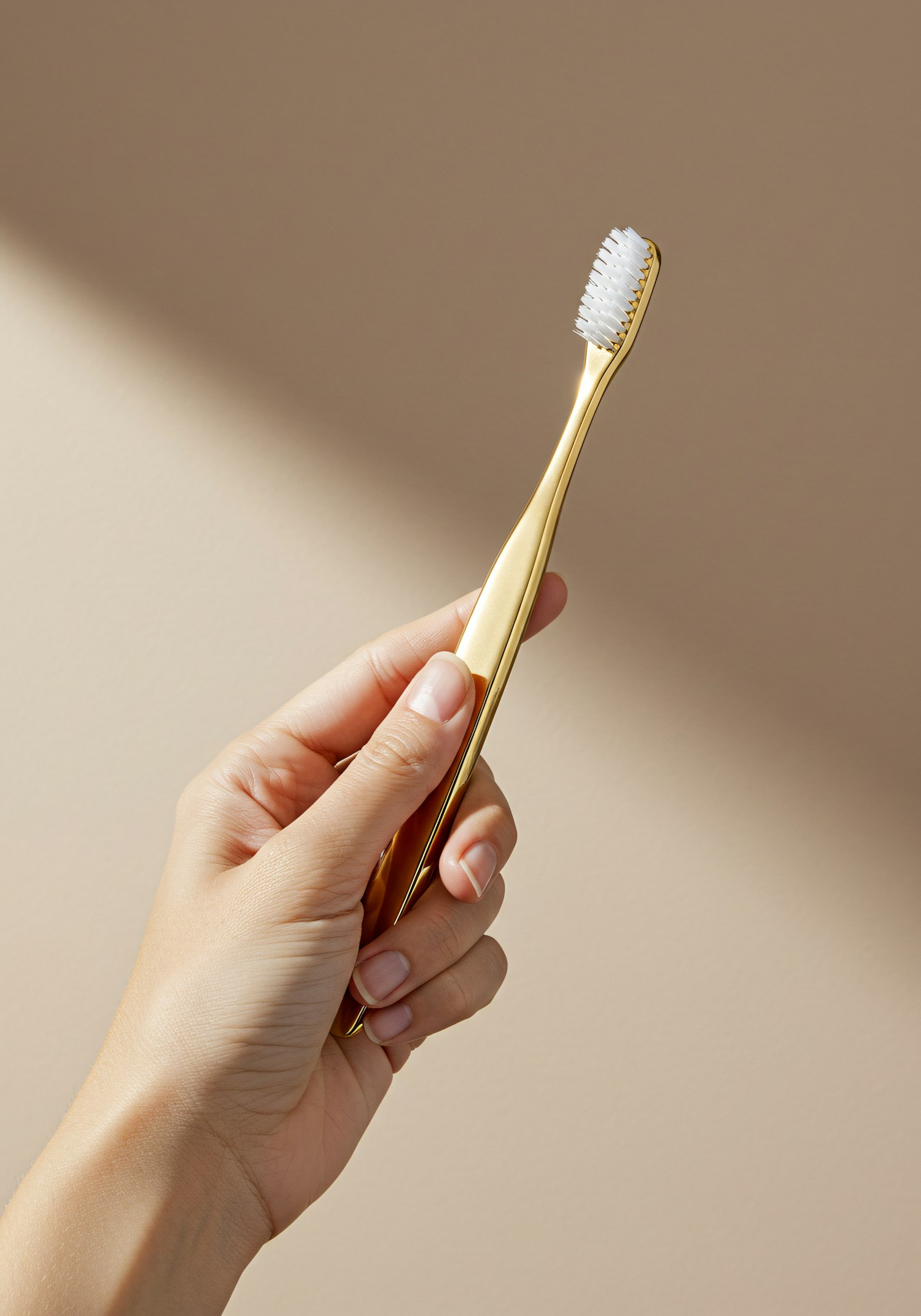 A hand holding a sleek golden toothbrush with white bristles against a soft beige background, showcasing minimalist elegance.