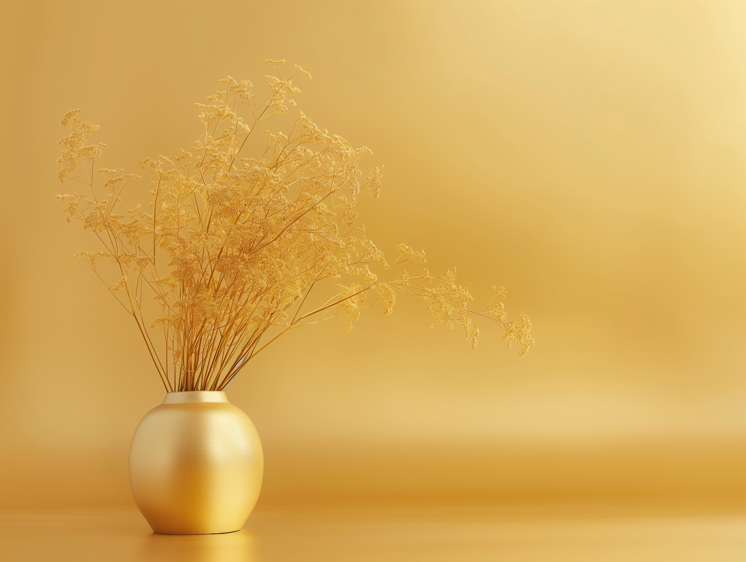 Elegant golden vase with dried flowers on a matching golden background, exuding luxury and tranquility.