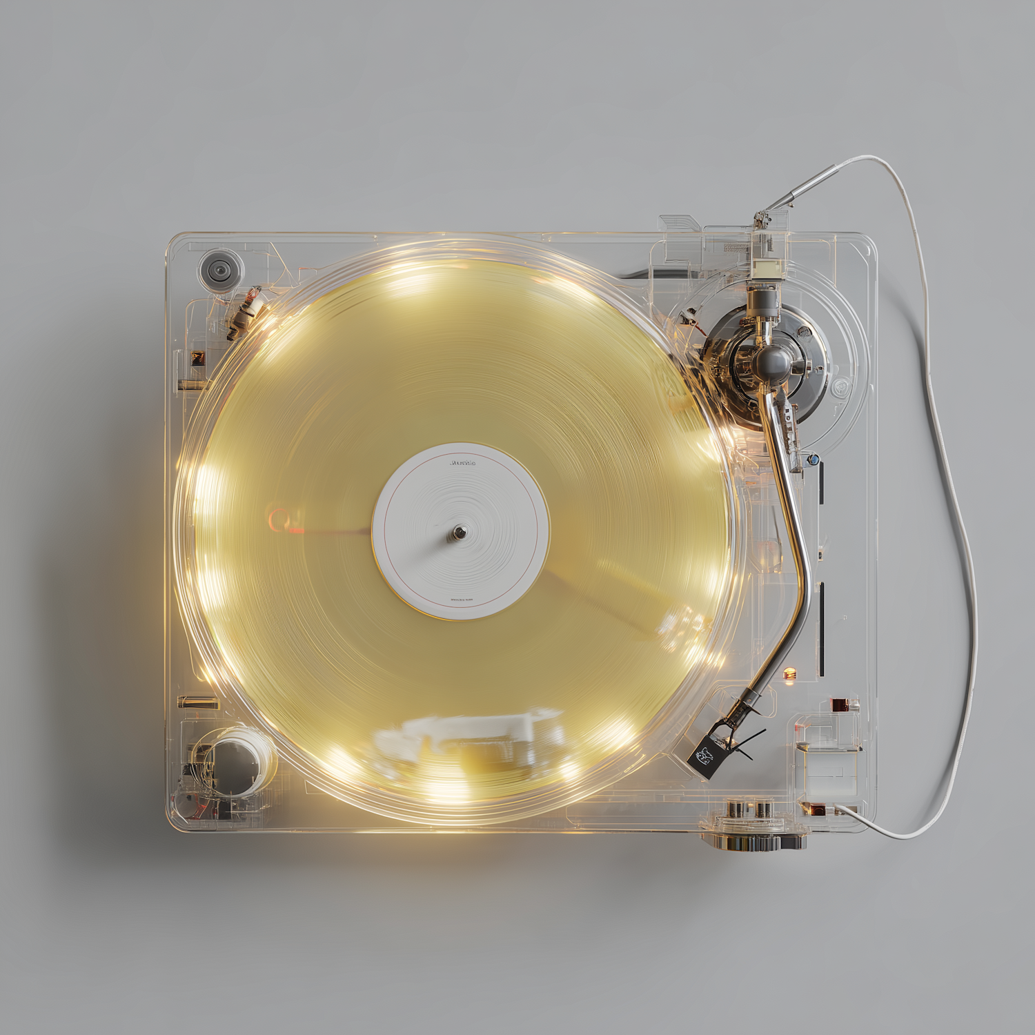 Transparent turntable with a glowing golden vinyl record, showcasing a sleek and modern design with intricate details.