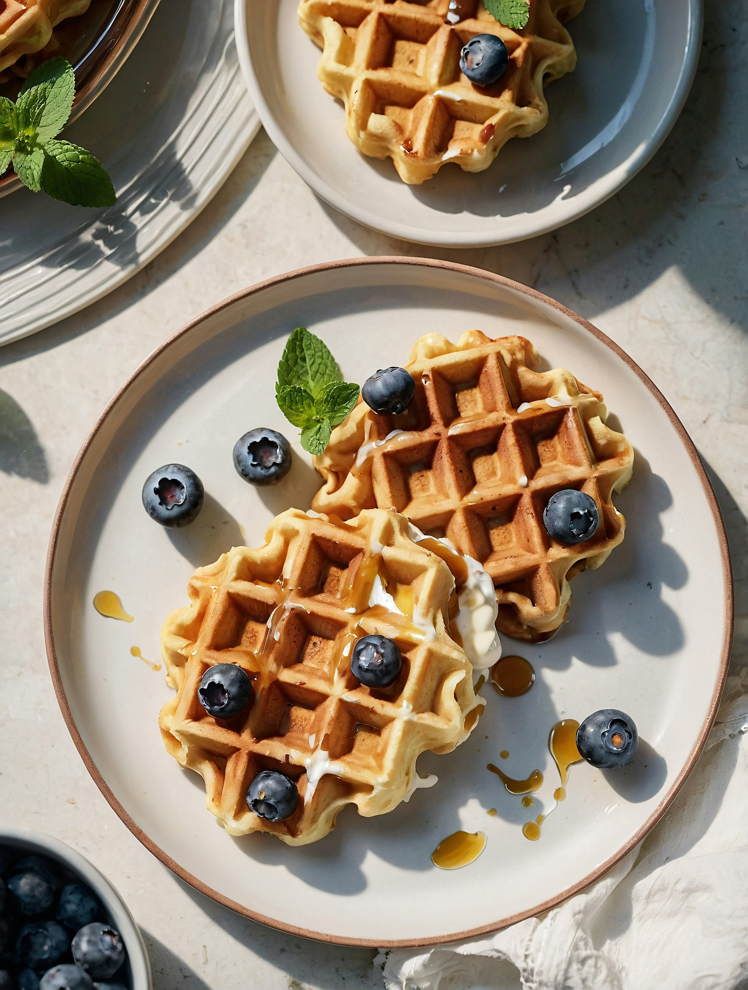 Golden waffles topped with blueberries, cream, and syrup on a white plate, garnished with mint. Perfect for a delicious breakfast vibe.