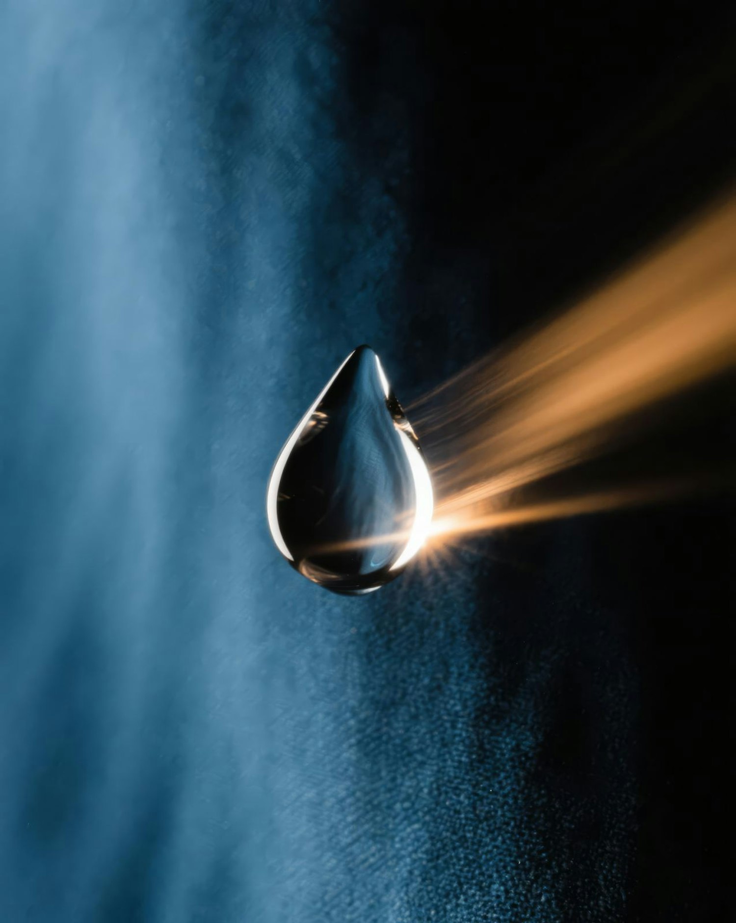 A close-up of a water droplet illuminated by golden light against a textured blue background, showcasing light refraction and clarity.