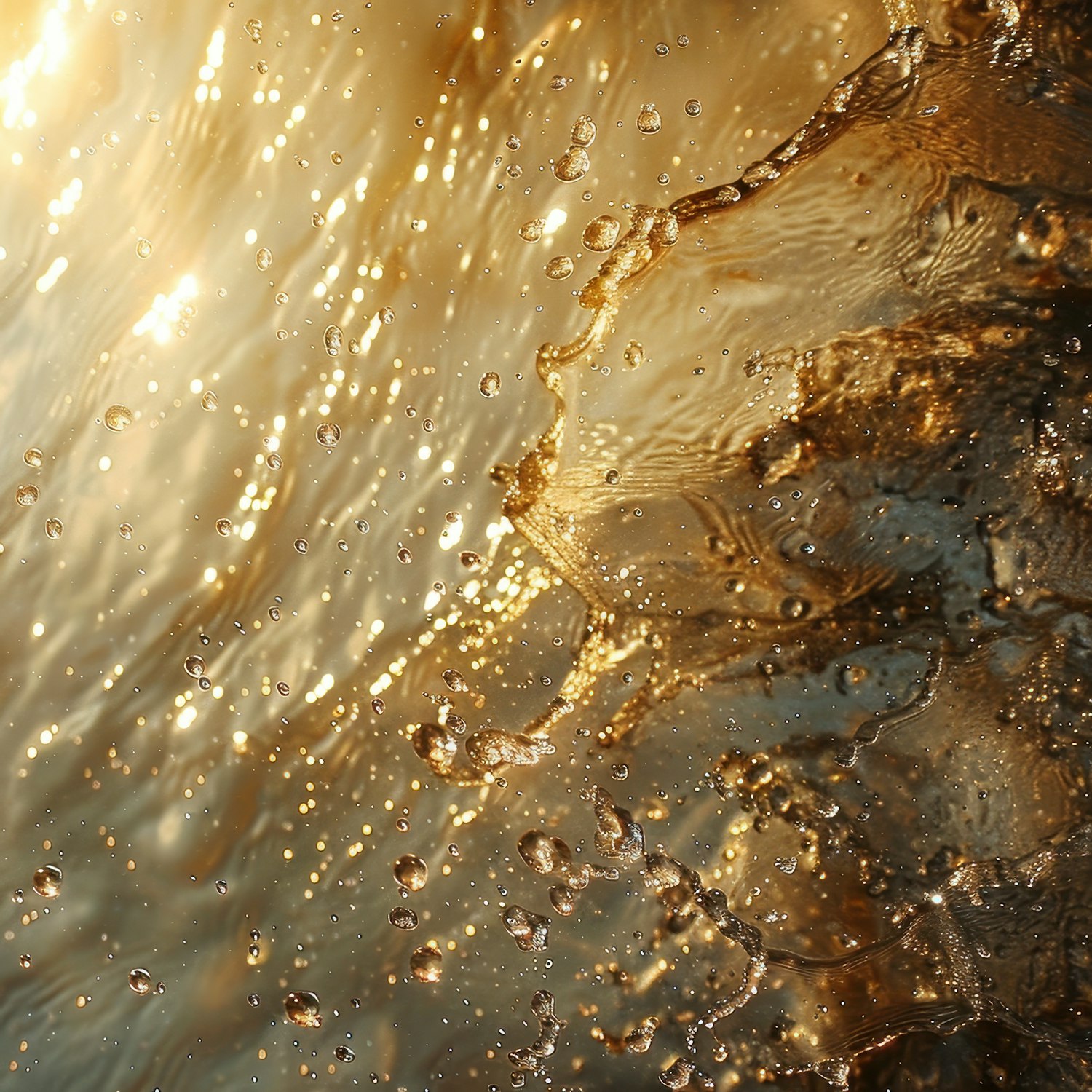 Golden water droplets captured in motion, illuminated by warm light, creating a dynamic and fluid texture.