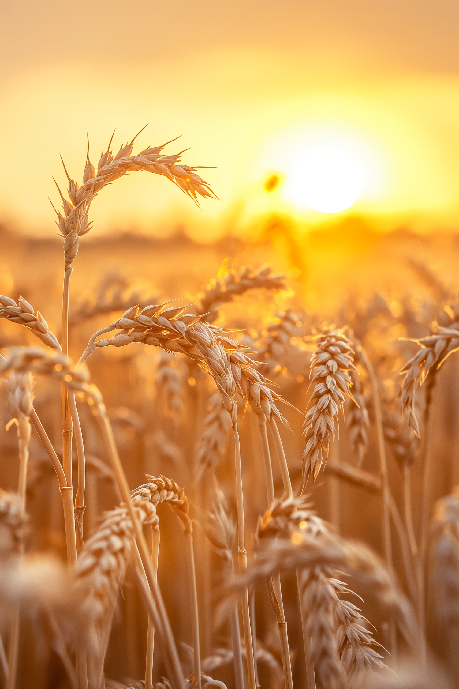 Golden wheat field at sunset, with sunlit stalks swaying gently, creating a serene and tranquil harvest scene.