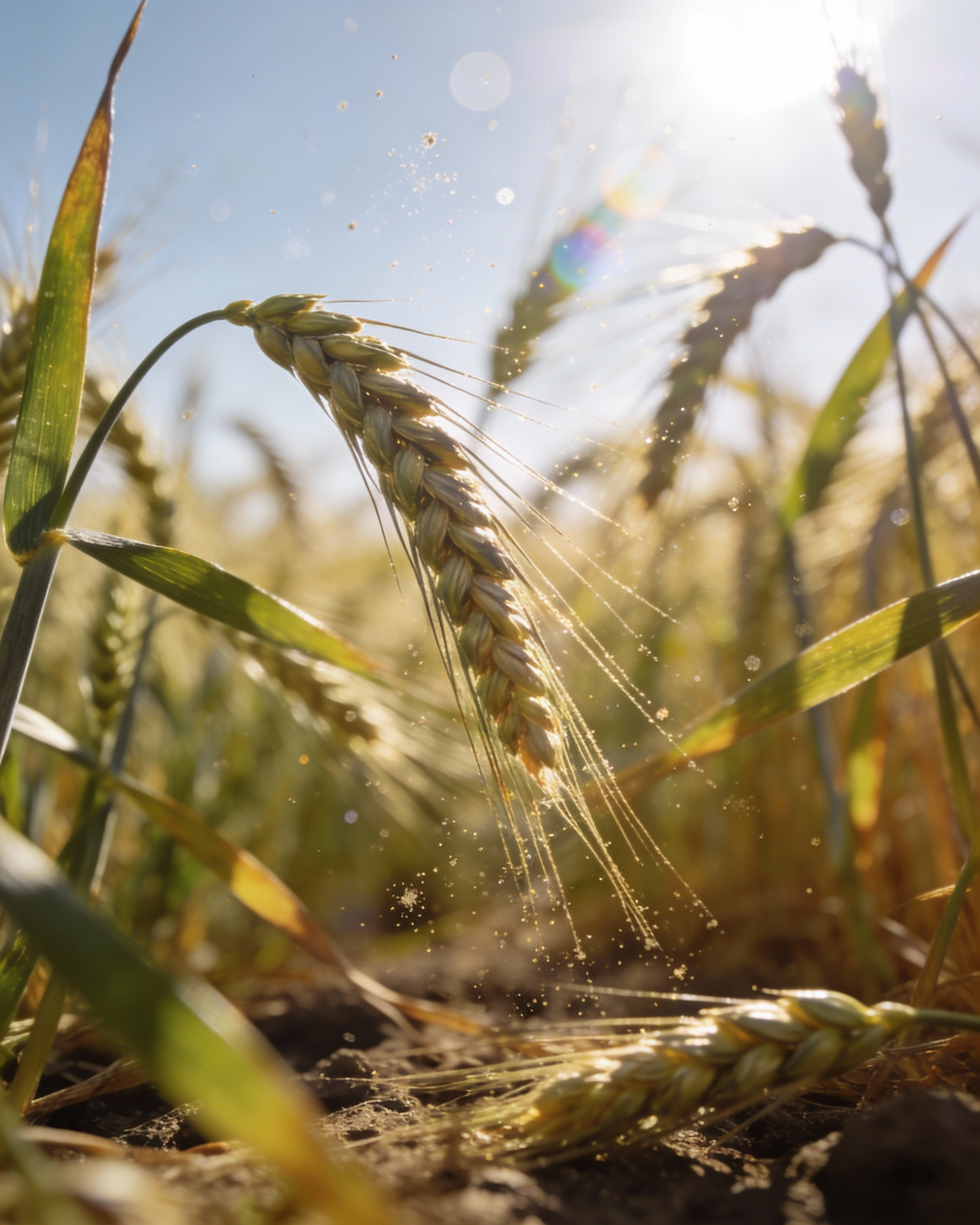 Ultra-realistic close-up landscape photograph, low-angle tight frame of wheat blades and seed heads backlit by clean sunshine, tiny dust motes in the air catching light (subtle, not sparkly), smooth highlight roll-off, vibrant natural color, slight motion in wheat, 50 mm look, f/4.0, ISO 100, 1/1000 s; circular polarizer to control glare—avoid rainbow banding. Negative: glittery specular wheat, HDR, starburst, blown highlights, halos, over-clarity.