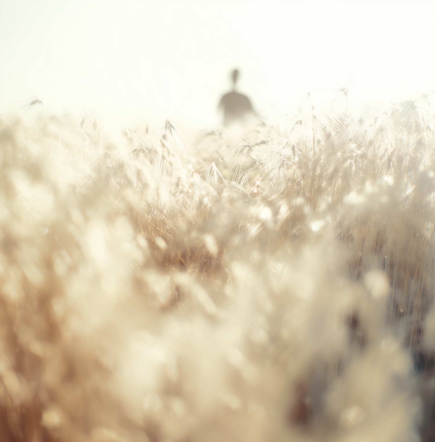 Golden wheat field with soft sunlight and a blurred silhouette in the distance, evoking a peaceful and dreamy mood.