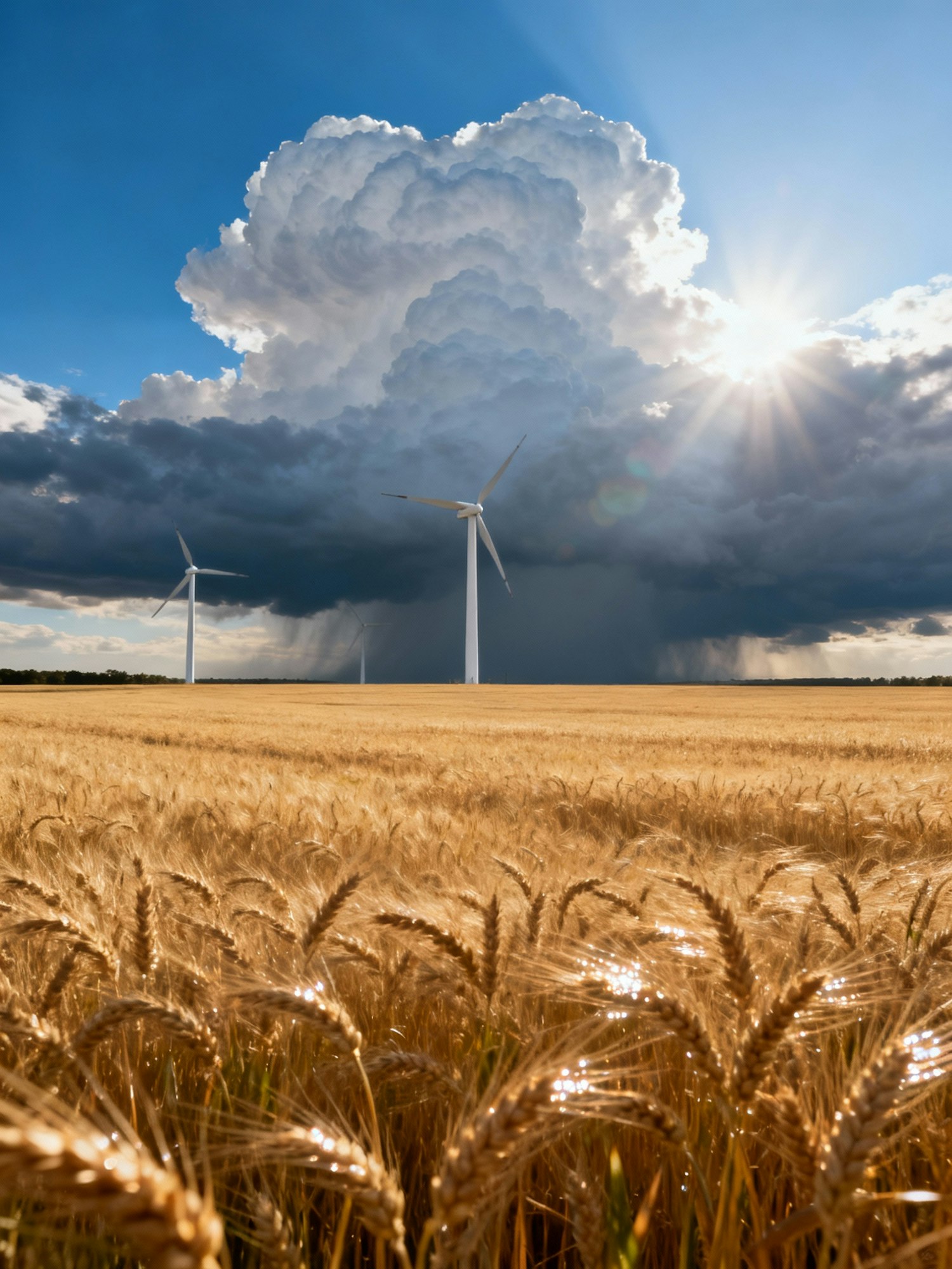 Golden wheat field rolling to the horizon with modern wind turbines; receding storm head and towering cumulus; sun burst opens and rakes the crop with specular highlights; slight motion in wheat; 24 mm, f/7.1, ISO 100, 1/250 s; circular polarizer to enrich sky and control leaf glare—avoid rainbow banding. Negative: gray haze left uncorrected, over-clarity, halo edges, oversaturated yellow.